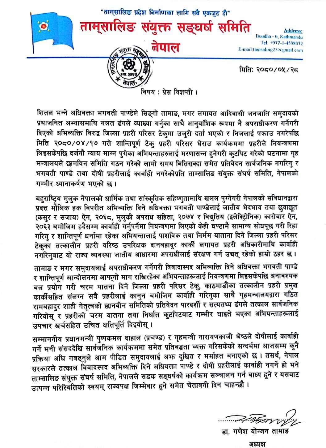 'बहुराष्ट्रिय मुलुक नेपालको धार्मिक तथा सांस्कृतिक सहिष्णुतामाथि खलल पुग्नेगरी नेपालको संविधानद्वारा प्रदत्त मौलिक हकविपरीत अभिव्यक्ति दिने अधिवक्ता भगवती पाण्डेलाई जातीय भेदभाव तथा छुवाछूत (कसुर र सजाय) ऐन, २०६८, मुलुकी अपराध संहिता, २०७४ र विद्युतिय (इलेक्ट्रिोनिक) कारोबार ऐन, २०६३ बमोजिम हदैसम्म कार्वाही गर्नुपर्नेमा नियन्त्रणमा लिएको केही घण्टामै सामान्य सोधपूछ गरी रिहा गरिनु र शान्तिपूर्ण धर्नामा रहेका अभियन्तालाई पाशविक तथा निर्मम याताना दिने जिल्ला प्रहरी परिसर टेकुका तत्कालीन प्रहरी वरिष्ठ उपरिक्षक दानबहादुर कार्की लगायत प्रहरी अधिकारीमाथि कार्वाही नगरिनुबाट यो राज्य व्यवस्था जातीय आधारमा अपराधीलाई संरक्षण गर्न उद्यत् रहेको हाम्रो ठहर छ,' विज्ञप्तिमा उल्लेख छ ।