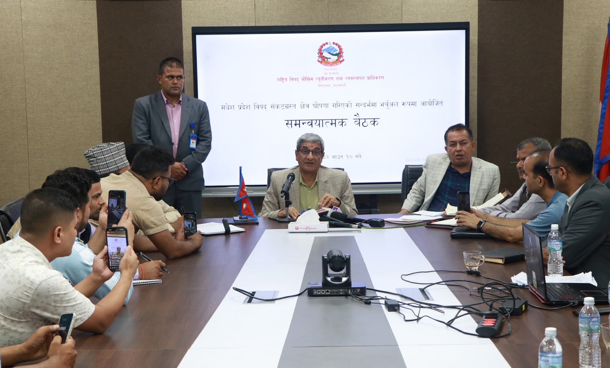 आज राष्ट्रिय विपद् जोखिम न्यूनीकरण तथा व्यवस्थापन प्राधिकरणद्वारा 'भर्चुअल' रुपमा आयोजित समन्वयात्मक बैठकमा मन्त्री लेखकले नागरिकको पीडामा सरकार गम्भीर रहेकोले गृह मन्त्रालयको प्रस्तावमा मधेश प्रदेशलाई विपद् संकटग्रस्त क्षेत्र घोषणा गरिएको जानकारी दिनुभयो।