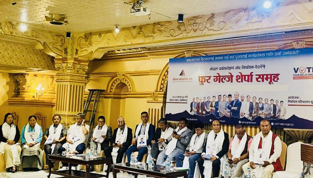 काठमाडौँ । कांग्रेस-एमाले गठबन्धनका उम्मेदवारलाई पछार्दै पर्वतीय पर्यटन व्यवसायीहरूको छाता संस्था नेपाल पर्वतारोहण सङ्घ (एनएमए)को अध्यक्ष पदमा फुरगेल्जे शेर्पा निर्वाचित हुनुभएको छ । आइतबार बिहान सम्पन्न मतगणनाअनुसार शेर्पाले अर्का उम्मेदवार कुलबहादुर गुरुङलाई पराजित गर्नुभएको थियो । शेर्पाले तीन सय ४२ मत र गुरुङले दुई सय ८८ मत प्राप्त गर्नुभएको निर्वाचन समितिले जनाएको छ ।