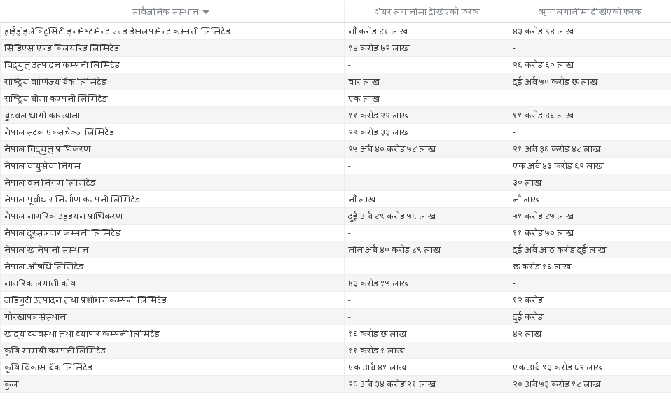 सार्वजनिक ऋण व्यवस्थापन कार्यालयले सार्वजनिक गरेको ‘नेपाल सरकारको शेयर तथा ऋण लगानीको वार्षिक प्रतिवेदन–आर्थिक वर्ष २०८१/८२’ अनुसार यस अवधिसम्ममा नेपाल सरकारले विभिन्न १५९ वटा सार्वजनिक संस्थान तथा निकायहरुमा सेयर तथा ऋणका रुपमा रू नौ खर्ब ३० अर्ब ८८ करोड चार लाख ६८ हजार लगानी गरेको छ । जसमध्ये सेयर लगानी ११६ संस्थानमा रू चार खर्ब चार अर्ब ८१ करोड ४१ लाख ५८ हजार रहेको छ ।
