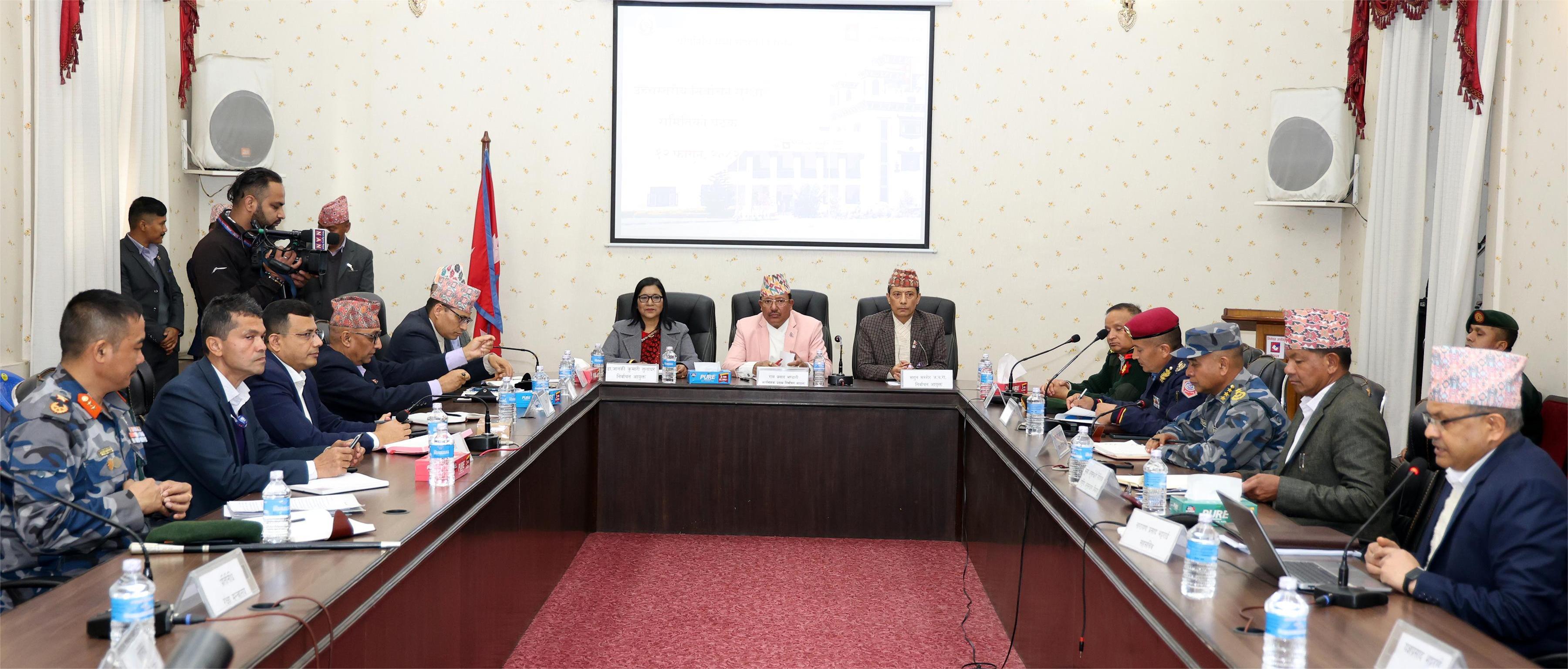 उच्चस्तरीय निर्वाचन सुरक्षा समितिको बैठकमा योजनाको समीक्षा, सुरक्षा वस्तुस्थितिको आकलन तथा सुरक्षा व्यवस्थासम्बन्धी मार्गदर्शन तथा सिफारिसका आधारमा निर्वाचनलाई स्वच्छ, विश्वसनीय तथा भयरहित वातावरणमा सम्पन्न गर्न मन्त्रालयलाई लेखी पठाउने निर्णय भएको हो । यसका लागि फागुन १८ गते राति १२ः०० बजेदेखि लागू हुने निर्वाचन प्रचारप्रसार निषेध अवधिमा पालना गर्नुपर्ने निर्वाचन आचारसंहिताको पूर्ण पालना गर्न गराउन गृहमन्त्रालयले सबै जिल्लाका प्रमुख जिल्ला अधिकारी र सुरक्षा निकायहरूलाई निर्देशन दिइएको छ ।