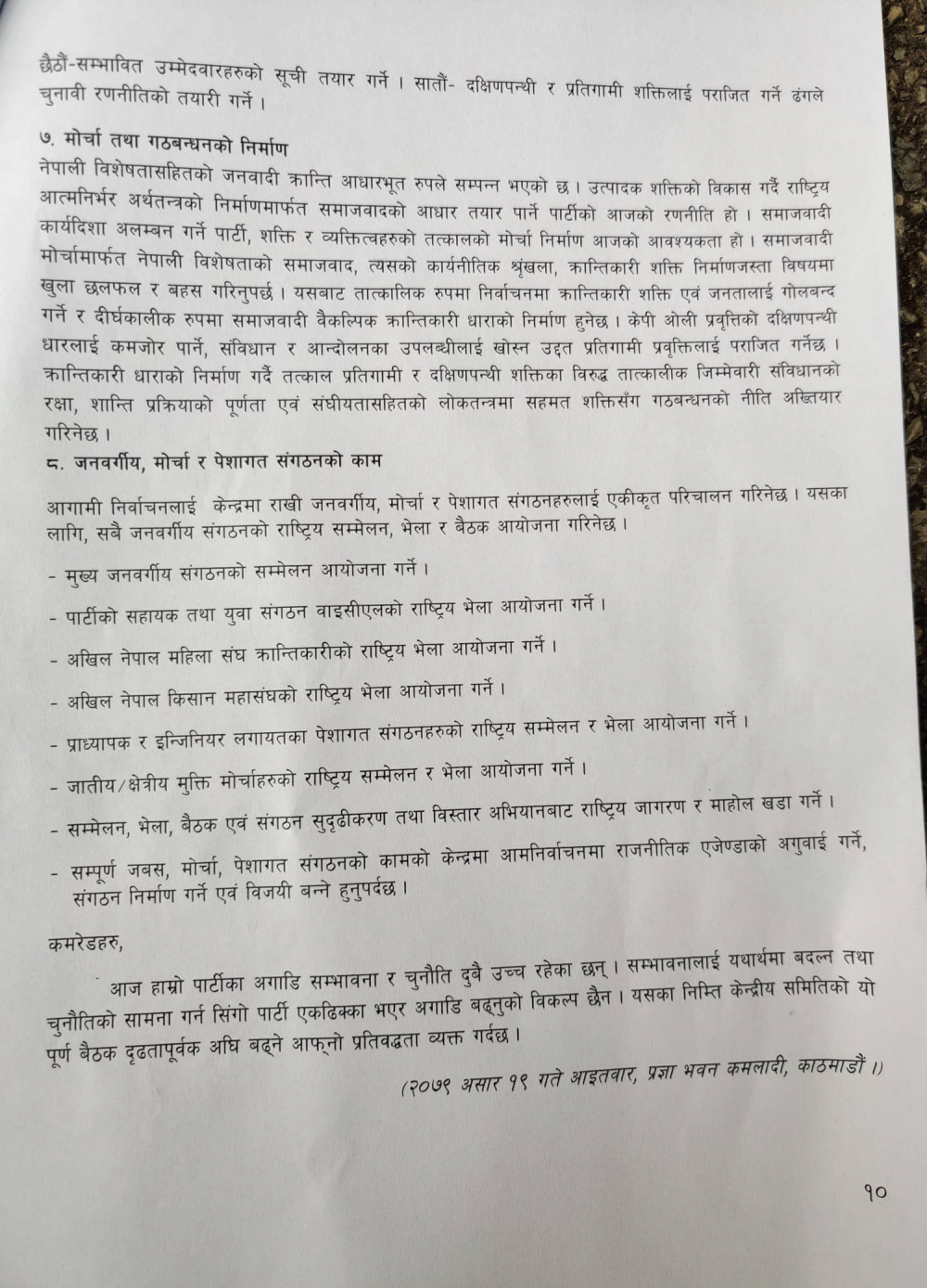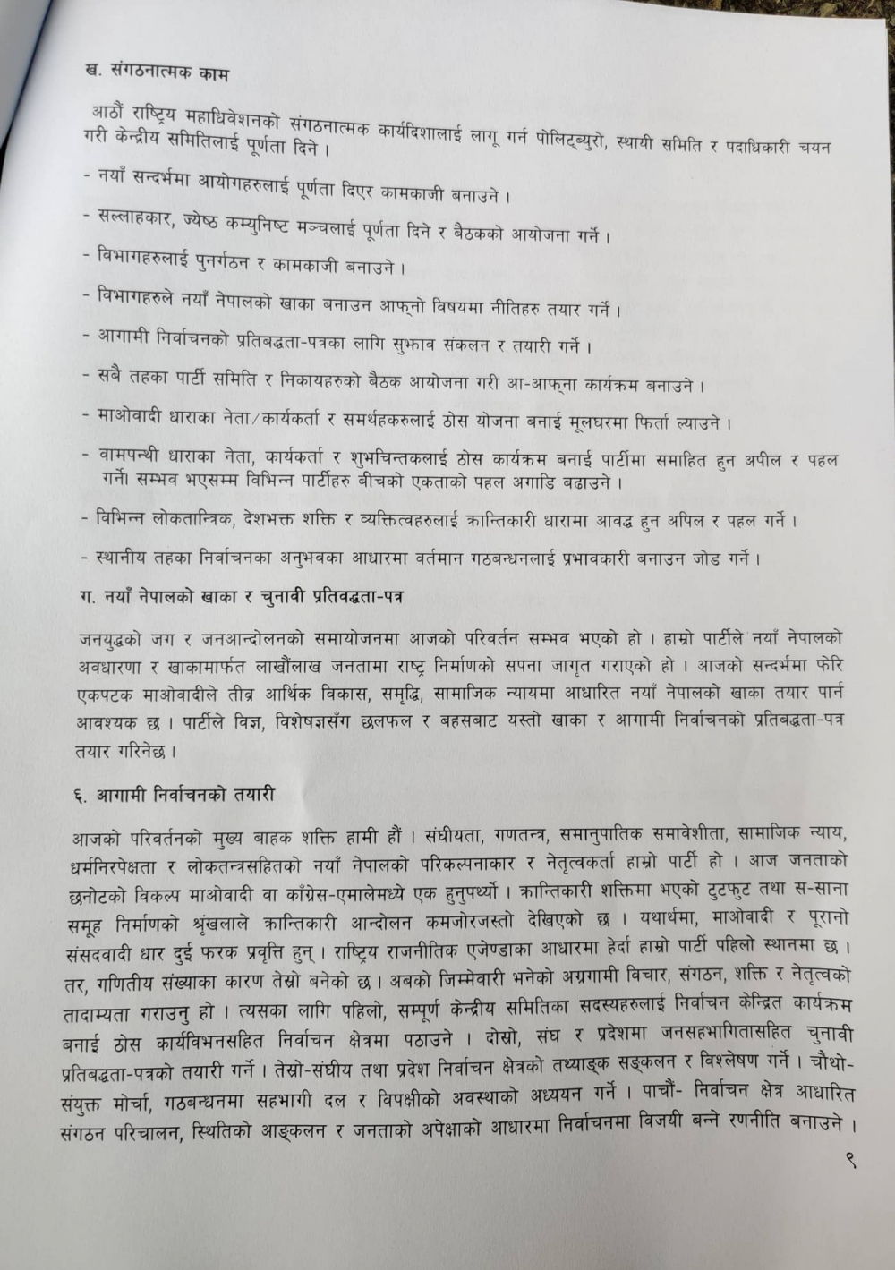वामपन्थी धाराका नेता तथा कार्यकर्ता, समर्थक र शुभचिन्तकलाई ठोस कार्यक्रमका साथ पार्टीमा समाहित हुन आग्रह गर्ने, विभिन्न पार्टीसँग एकताका लागि पहल गर्ने, स्थानीय तहको निर्वाचनको अनुभवका आधारमा वर्तमान गठबन्धनलाई प्रभावकाारी बनाउन जोड गर्ने विषय सङ्गठनात्मक कामका रुपमा उल्लेख गरिएको छ ।