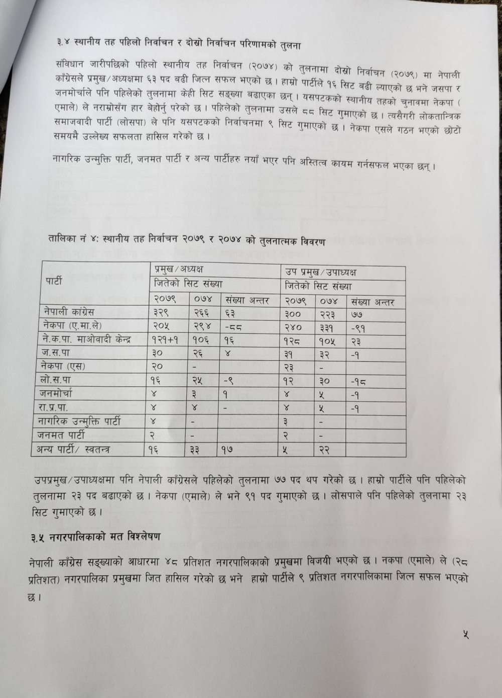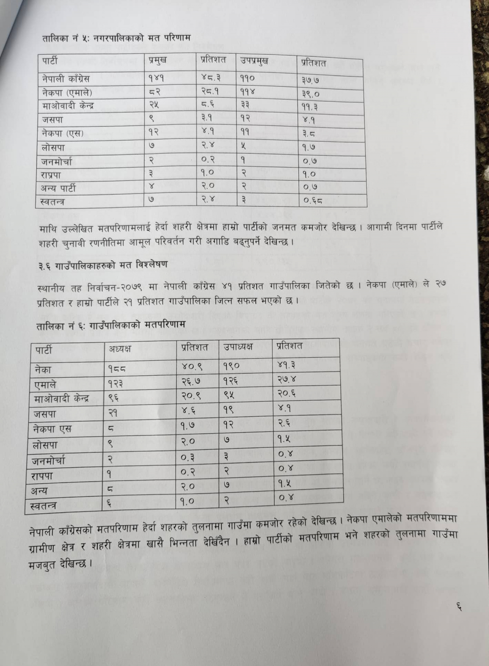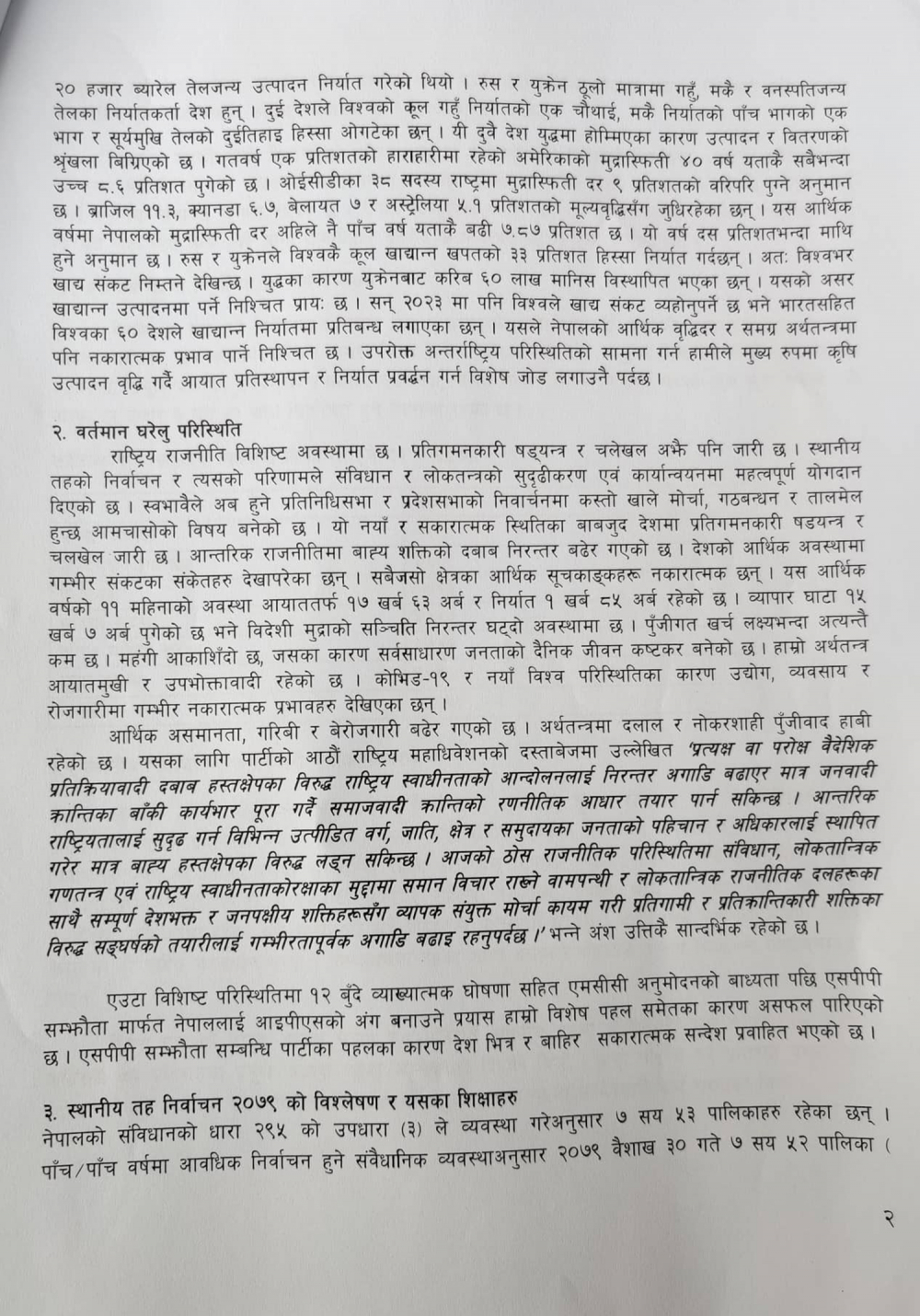 “नयाँ संविधानअन्तर्गत दोस्रो पटक सङ्घीय एवम् प्रादेशिक निर्वाचन केही महिनामा हुँदैछ । स्थानीय तहको निर्वाचनमा हाम्रो पार्टीलाई पराजित गर्ने र सीमान्त शक्तिमा बदल्न चाहने शक्तिहरू स्वयम् नराम्ररी पराजित भएका छन् । माओवादी पार्टी पुनः शक्तिशाली बन्ने स्पष्ट संकेत देखिएको छ । यस निर्वाचनको शिक्षालाई गम्भीर रुपमा आत्मसात् गर्दै आगामी आम निर्वाचनको घनिभूत तयारीमा लाग्नु आजको प्रमुख जिम्मेवारी हो”, अध्यक्ष दाहालको प्रतिवेदनमा भनिएको छ ।