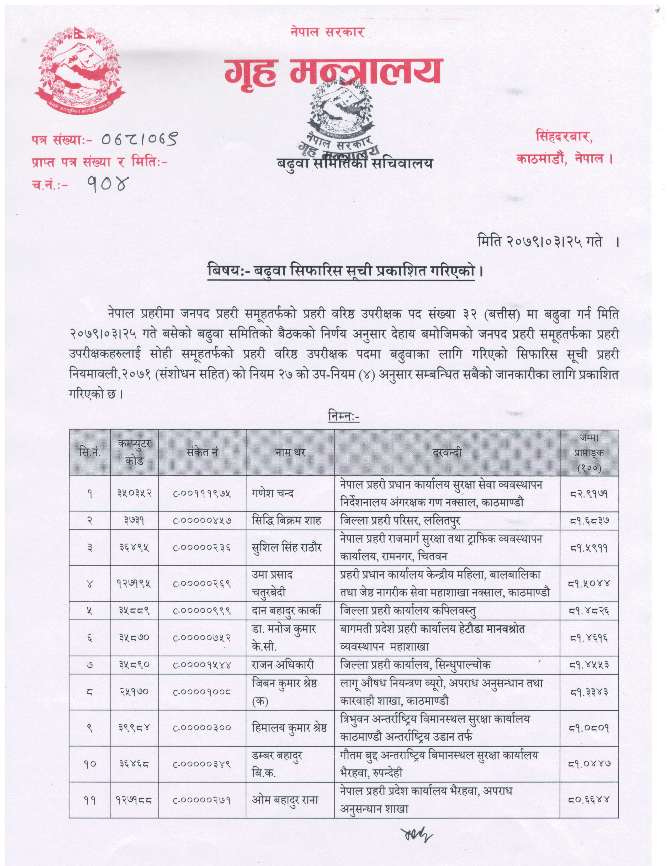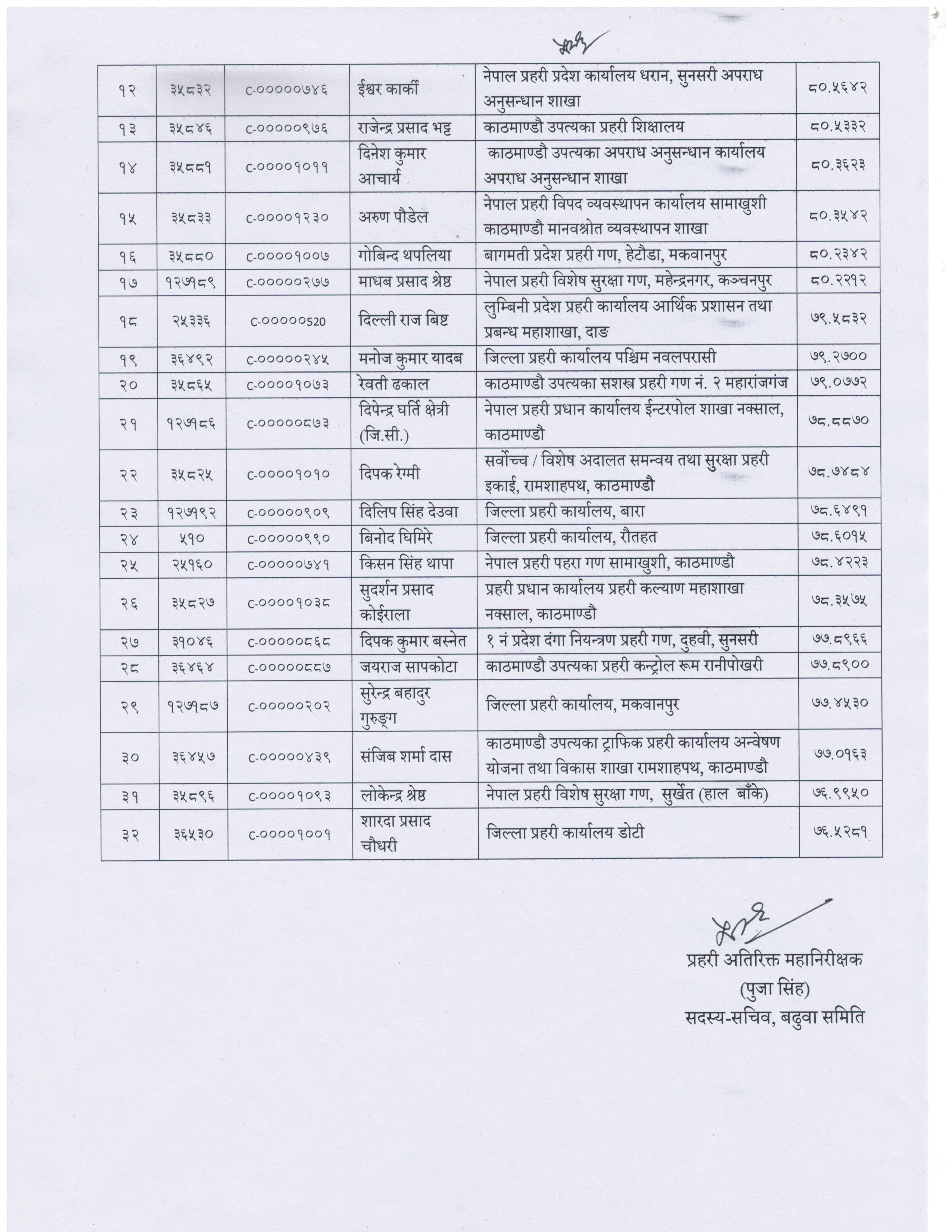 उहाँहरुलाई प्रहरी नियमावली, २०७१ (संशोधनसहित)को नियम २७ को उपनियम (४) अनुसार बढुवाका लागि सिफारिस गरिएको बढुवा समितिका सदस्यसचिव एवं प्रहरी अतिरिक्त महानिरीक्षक पूजा सिंहले जानकारी दिनुभयो ।