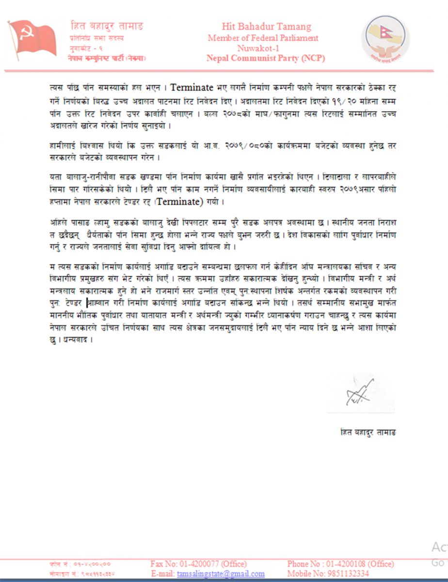 'मैले त्यस सडक निर्माणलाई अगाडि बढाउने सम्बन्धमा केही दिनअघि मन्त्रालयका सचिव र अन्य विभागीय प्रमुखहरुसँग भेटको थिएँ । त्यस क्रममा उहाँहरु सकारात्मक देखिनुहुन्थ्यो । विभागीय मन्त्री र अर्थ मन्त्रलाय सकारात्मक हुने हो भने राजमार्ग स्तरोन्नति एवम् पुनःस्थापना शीर्षकअन्तर्गत रकमको व्यवस्थापन गरी पुनः टेण्डर आह्वान गरी निर्माण कार्यई अगाडि बढाउन सकिन्छ भन्ने थियो । तसर्थ सम्मानीय सभामुखमार्फत माननीय भौतिक पूर्वाधार तथा यातायातमन्त्री र अर्थमन्त्रीको गम्भीर ध्यानाकर्षण गराउन चाहन्छु,' उहाँले भन्नुभयो ।