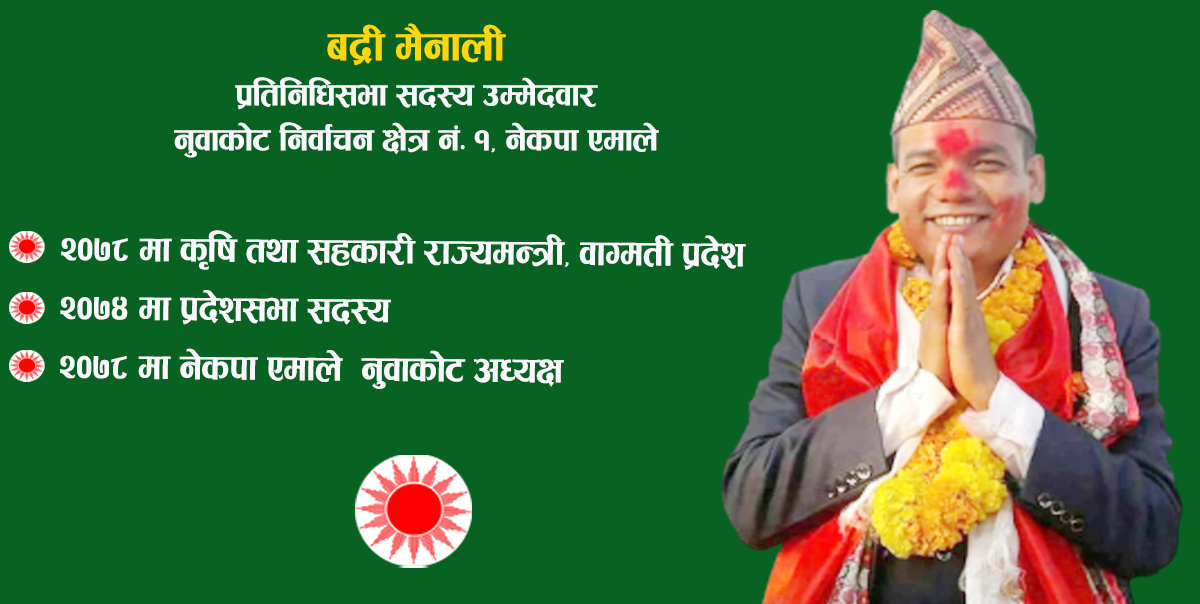 व्यावसायिक पृष्ठभूमिबाट राजनीतिमा होमिनुभएका बद्री मैनाली नुवाकोट निर्वाचन क्षेत्र नम्बर १ मा नेकपा एमालेबाट प्रतिनिधिसभा उम्मेदवार हुनुहुन्छ ।