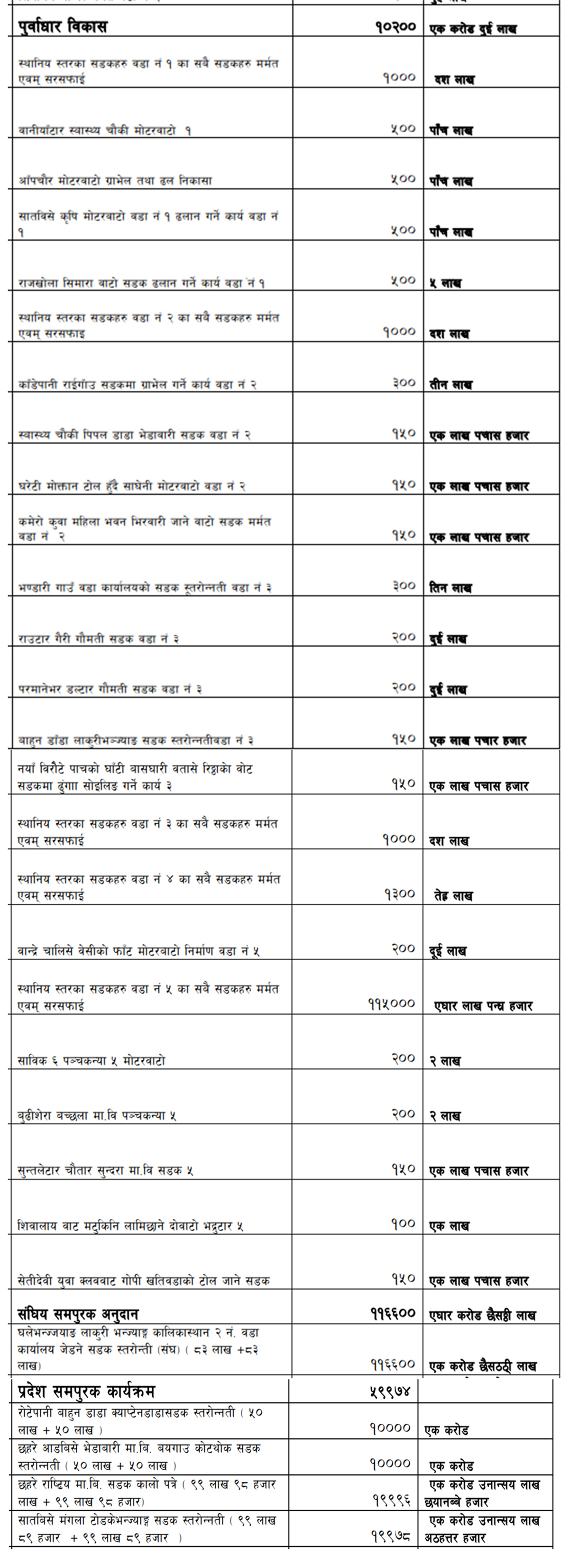 स्थानीयस्तरका सडकहरु मर्मत एवं सरसफाइका लागि गत वर्षहरुमा जस्तै १ मा १० लाख, २ मा १० लाख, ३ मा १० लाख ४ मा १३ लाख, ५ मा ११ लाख १५ हजार छुट्याइएको छ । वडा सडक सफाइमा उपभोक्ता समितिहरुले यसअघि डोजर लगाएर माटो खोर्सिने गरी बजेट सकाउने गरेको आरोप स्थानीय लगाउँदै आएको छ ।