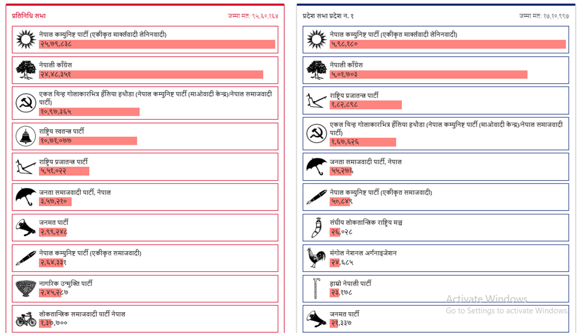 समानुपातिक निर्वाचन प्रणालीअन्तर्गत राजनीतिक दलको चुनाव चिह्मा मतदान गरिने हुनाले दलको लोकप्रियता निर्धारण हुन्छ । निर्वाचन आयोगका अनुसार मंगलबार बिहान पौने ९ बजेसम्म गणना गरिएको मतअनुसार नेकपा (एमाले)ले २५ लाख ७९ हजार ८ सय ३८ मत प्राप्त गरेको छ ।