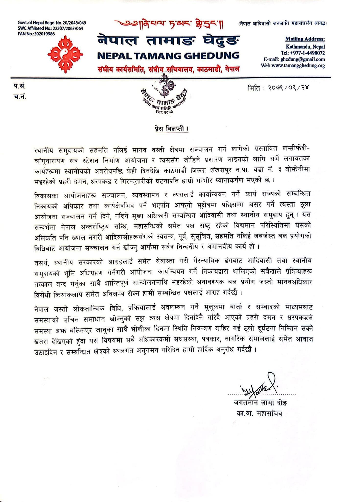घेदुङका कार्यवहाक महासचिव जगतमान लामा दोङले आइतबार विज्ञप्ति जारी गर्नुहुँदै प्रस्तावित लप्सीफेदी–चाँगुनारायण सवस्टेशन निर्माण आयोजना र त्यससँग जोडिने प्रसारण लाइनका लागि सर्भेलगायत कार्यका क्रममा स्थानीयको विरोधपछि राज्य पक्षले गरिरहेको ज्यादतीप्रति घेदुङको ध्यानाकर्षण भएको जनाउनुभएको हो ।