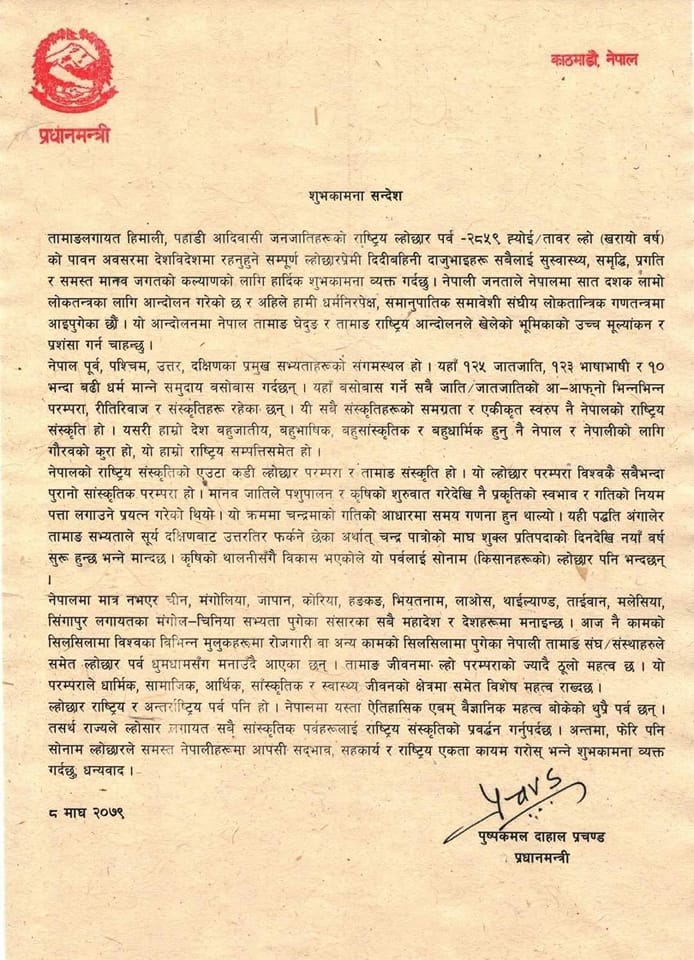 प्रधानमन्त्री दाहालले ल्होछारको अवसरमा देश–विदेशमा रहनुहुने सम्पूर्ण ल्होछारप्रेमी दिदीबहिनी, दाजुभाइ सबैलाई सुस्वास्थ्य, समृद्धि, प्रगति र समस्त मानव जगत्को कल्याणका लागि हार्दिक शुभकामना व्यक्त गर्नुभएको छ । नेपाल पूर्व, पश्चिम, उत्तर, दक्षिणका प्रमुख सभ्यताहरूको सङ्गमस्थल भएको भन्दै उहाँले नेपालमा एक सय २५ जातजाति, एक सय २३ भाषाभाषी र १० भन्दा बढी धर्म मान्ने समुदाय बसोबास गर्ने बताउनुभयो ।