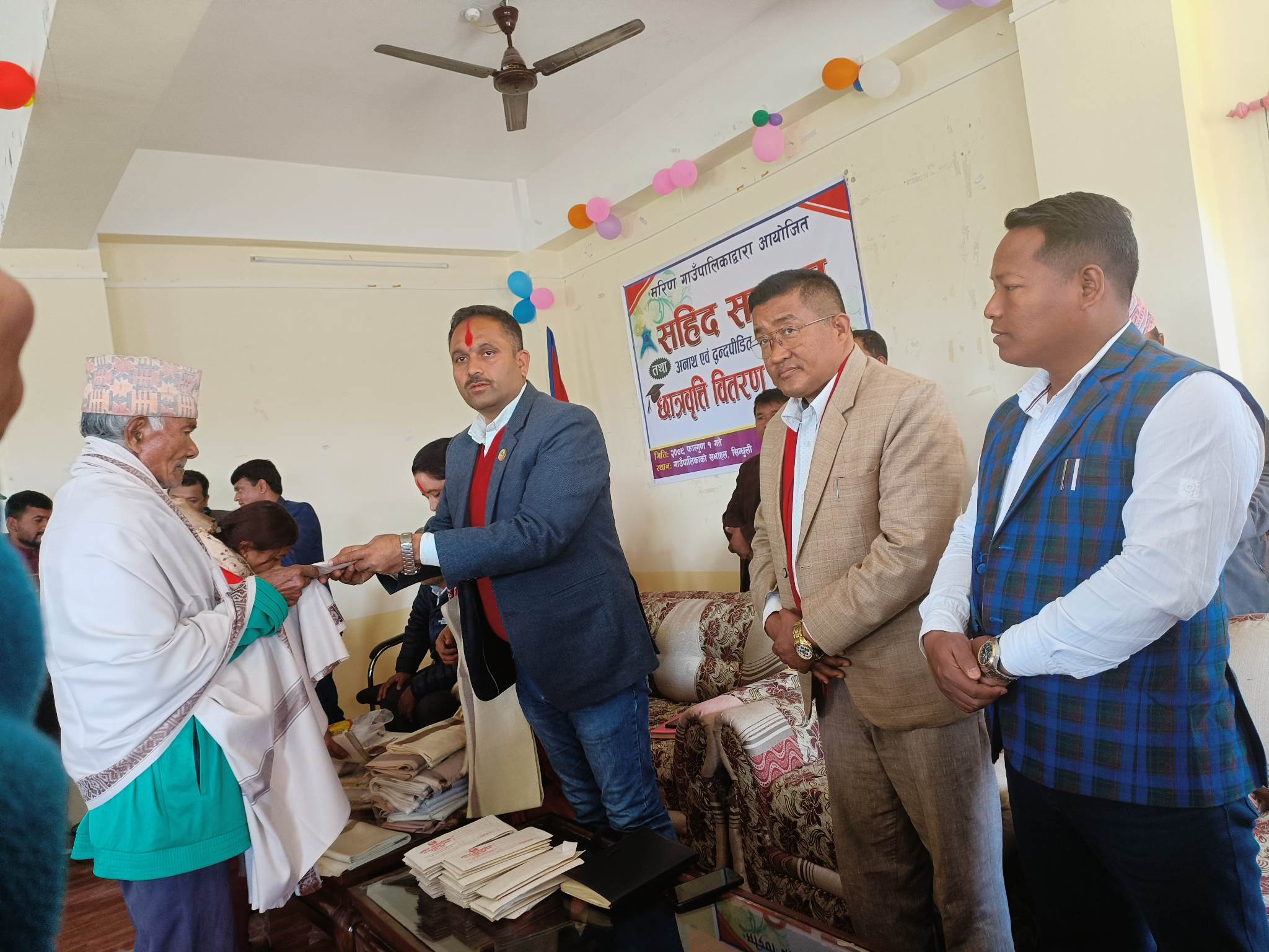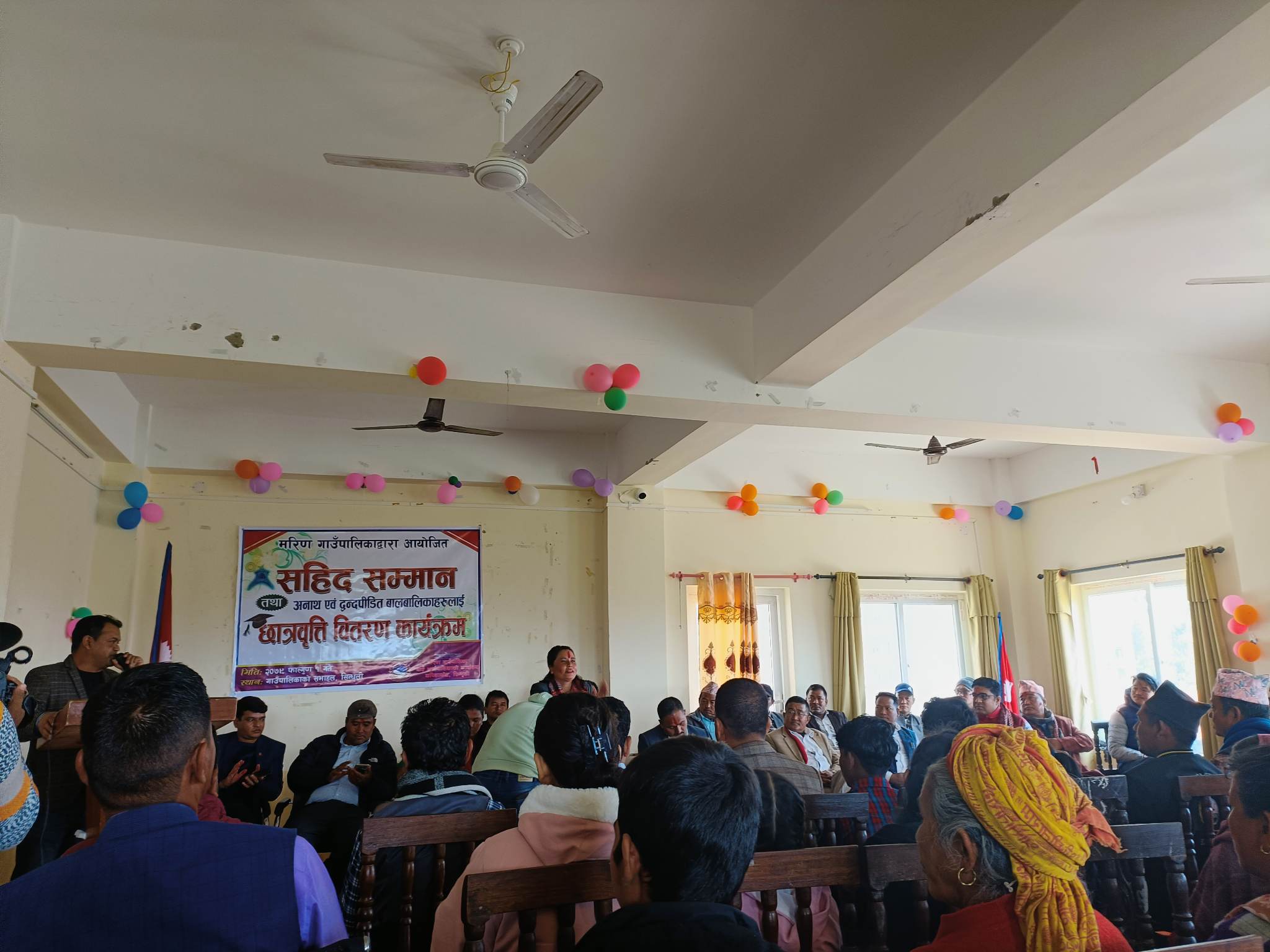 गाउँपालिका भवन कपिलाकोटमा सोमबार आयोजित 'सहिद परिवार सम्मान तथा अनाथ एवं द्वन्द्वपीडित बालबालिकालाई छात्रवृत्ति वितरण' कार्यक्रममा प्रमुख अतिथि एवं संघीय सांसद लेखनाथ दाहाल 'राजन', प्रदेश सांसद सुष्पा भुजेल, मरिण गाउँपालिका अध्यक्ष विमर्श मुक्तान 'प्रख्यात'ले सहिद परिवारलाई जनही २० हजार रुपैयाँका दरले आर्थिक सहयोग हस्तान्तरण गर्नुभएको हो ।