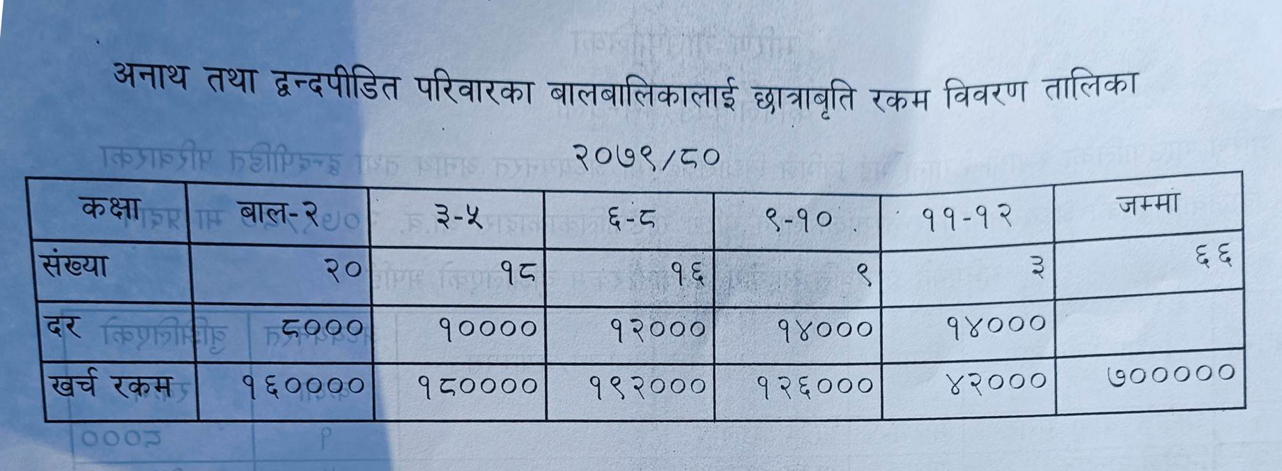 यस्तै अनाथ एवं द्वन्द्वपीडित विद्यार्थीहरु १ देखि ८ कक्षासम्मलाई ८ हजार, १० कक्षामा अध्ययनरतलाई १० हजार र ११-१२ कालाई १२ हजार रुपैयाँका दरले छात्रवृद्धि रकम प्रदान गरिएको छ । जसमा ७ लाख रुपैयाँभन्दा बढी खर्च गरिएको छ ।