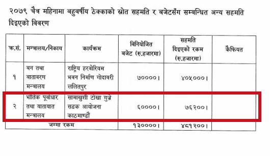 उक्त योजना तथा कार्यक्रमका लागि बहुवर्षीय ठेक्काको स्रोत सहमति दिइएको अर्थ मन्त्रालयले प्रस्ट पारेको छ । मन्त्रालयले नुवाकोटसँगै चालु आर्थिक वर्षको चैत महिनामा मात्र सरकारले ३३ अर्ब ३४ करोड ४५ लाख ८१ हजार बराबर रकमान्तर गरेको छ ।
