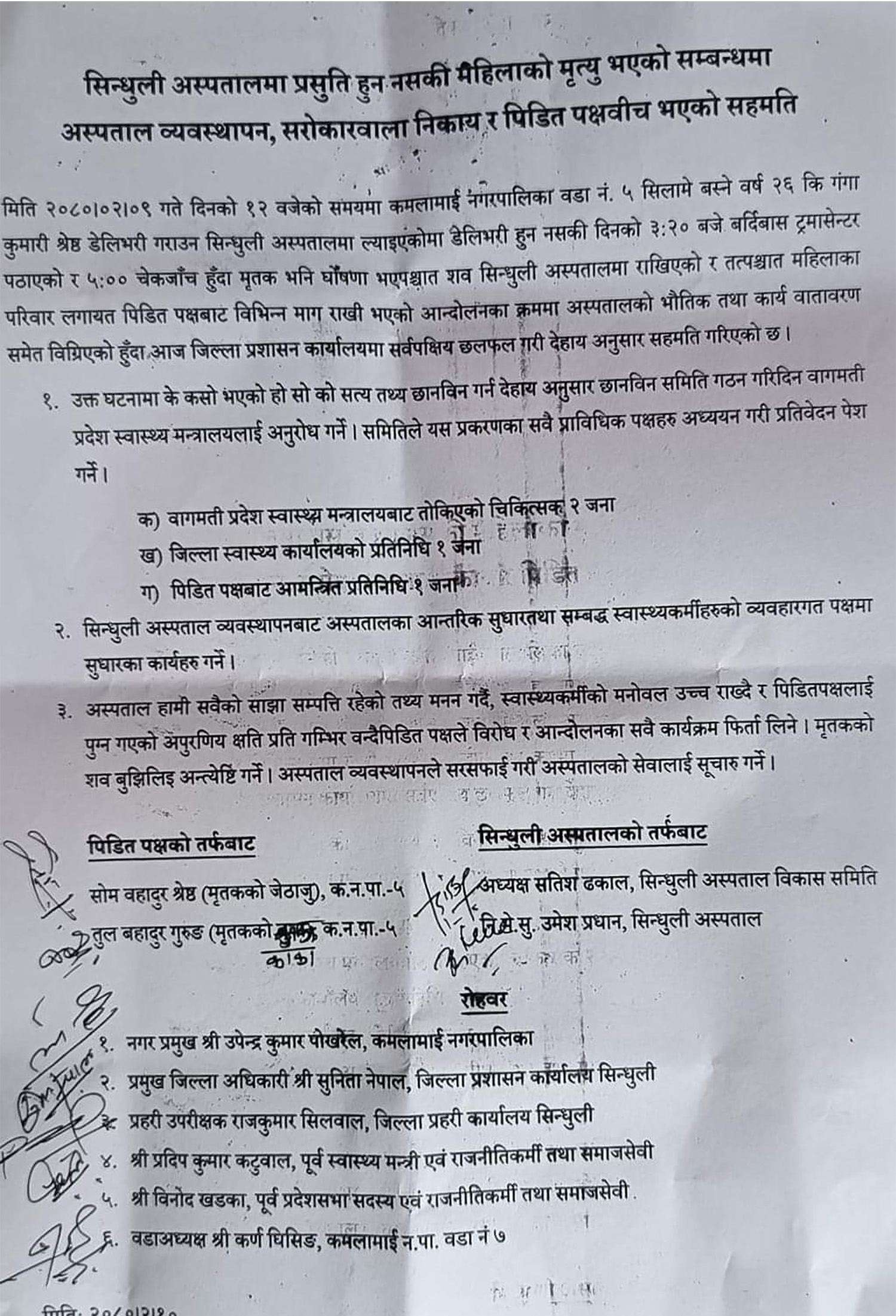 सहमति पत्रमा अस्पतालको तर्फबाट अस्पताल विकास समितिका अध्यक्ष सतिश ढकाल, निमित्त मेसु उमेश प्रधान र पीडित पक्षबाट मृतकको जेठाजु सोमबहादुर श्रेष्ठ र काका तुलबहादुर गुरुङले हस्ताक्षर गर्नुभएको छ । सहमतिका क्रममा कमलामाई नगरपालिकाका मेयर उपेन्द्रकुमार पोखरेल, प्रमुख जिल्ला अधिकारी सुनिता नेपाल, प्रहरी उपरीक्षक राजकुमार सिलवाल, पूर्वस्वास्थ्य प्रदीपकुमार कटवाल, पूर्वप्रदेश सांसद विनोद खड्का, कमलामाई नपा-७ वडाध्यक्ष कर्ण घिसिङ पनि उपस्थित थिए ।