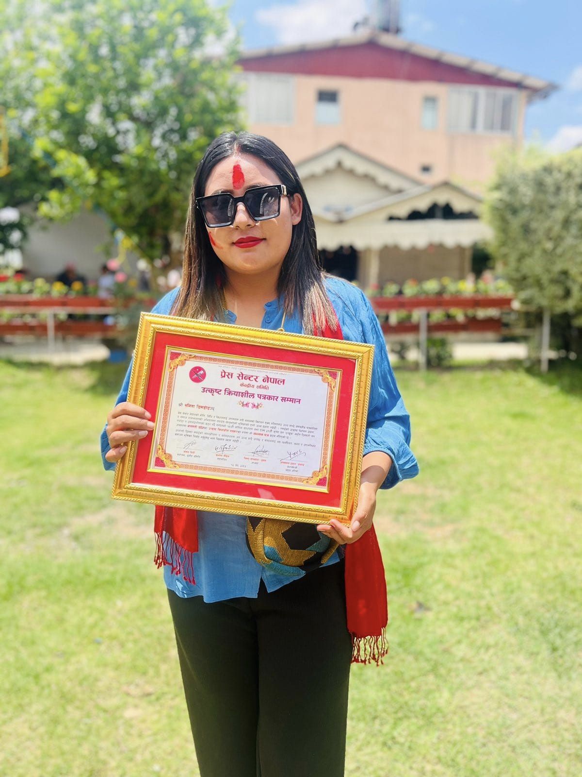 काठमाडौं । सिन्धुलीमा रहेर सक्रिय पत्रकारिता गर्दै आउनुभएका संगीता डिम्दोङलाई उत्कृष्ट पत्रकार सम्मान प्रदान गरिएको छ ।
