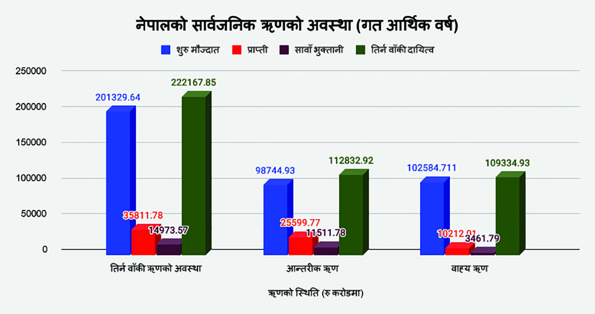 गत वर्षमा ऋणको साँवा ब्याज भुक्तानीमा सरकारले रू दुई खर्ब २२ अर्ब ७४ करोड २१ लाख खर्च गरेको छ । जसमध्ये, आन्तरिक ऋणको साँवा–ब्याज भुक्तानी रू एक खर्ब ७९ अर्ब ७२ करोड ५३ लाख र बाह्य ऋणको साँवा ब्याज भुक्तानीमा रू ४३ अर्ब एक करोड ६८ लाख बराबर खर्च भएको छ ।
