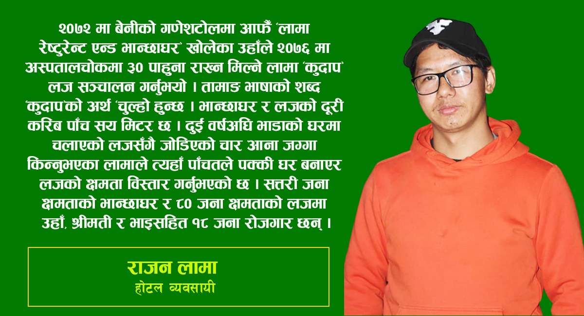तामाङ भाषाको शब्द ‘कुदाप’को अर्थ ‘चुल्हो हुन्छ । भान्छाघर र लजको दूरी करिब पाँच सय मिटर छ । दुई वर्षअघि भाडाको घरमा चलाएको लजसँगै जोडिएको चार आना जग्गा किन्नुभएका लामाले त्यहाँ पाँचतले पक्की घर बनाएर लजको क्षमता विस्तार गर्नुभएको छ । सत्तरी जना क्षमताको भान्छाघर र ८० जना क्षमताको लजमा उहाँ, श्रीमती र भाइसहित १८ जना रोजगार छन् । घरभाडामा मात्र रु एक लाख ५० हजार तिर्ने भान्छाघर र लजमा रु पाँच करोडभन्दा बढीको लगानी छ । रु छ लाख लगानीमा व्यवसाय सुरु भएको थियो ।