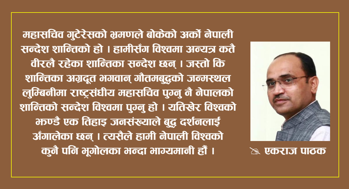 महासचिव गुटेरेसको भ्रमणले बोकेको अर्काे नेपाली सन्देश शान्तिको हो । हामीसँग विश्वमा अन्यत्र कतै वीरलै रहेका शान्तिका सन्देश छन् । जस्तो कि शान्तिका अग्रदूत भगवान् गौतमबुद्धको जन्मस्थल लुम्बिनीमा राष्ट्रसङ्घीय महासचिव पुग्नु नै नेपालको शान्तिको सन्देश विश्वमा पुग्नु हो । यतिखेर विश्वको झण्डै एक तिहाइ जनसङ्ख्याले बुद्ध दर्शनलाई अँगालेका छन् । त्यसैले हामी नेपाली विश्वको कुनै पनि भूगोलका भन्दा भाग्यमानी हौँ । बुद्धका शान्तिका सन्देश विश्व जति आधुुनिक, विकसित र कथित समृद्ध हुँदै गएको छ त्यति नै सान्दर्भिक हुँदै गएका छन् । शान्तिका नाममा विश्वको कुनै पनि मानिसका दिमागमा सबैभन्दा पहिला आउने बुद्ध हुन र स्थान लुम्बिनी हो ।
