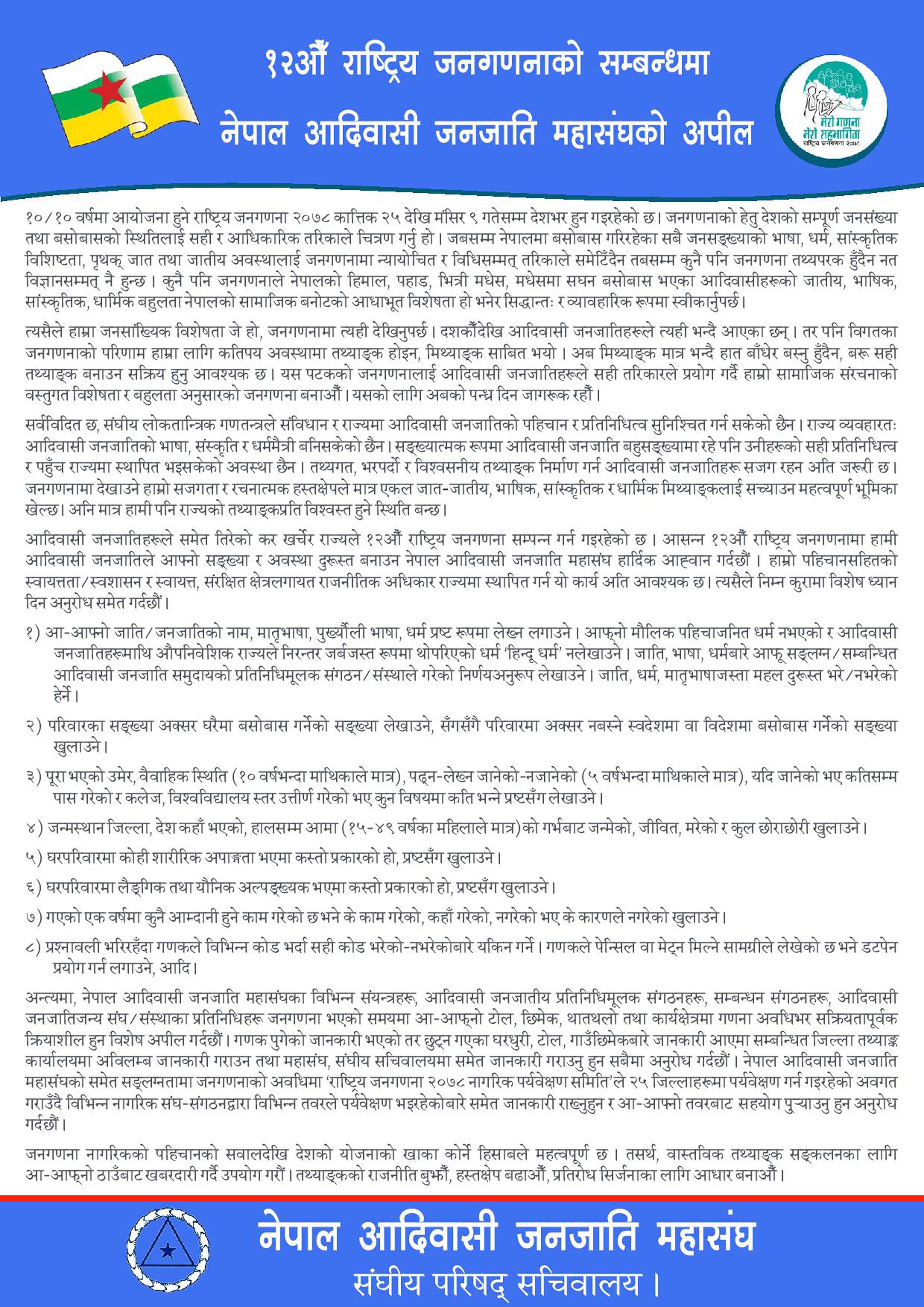 काठमाडौं । बिहीबारदेखि सुरु हुने १२ औं राष्ट्रिय जनगणनाको सम्बन्धमा आदिवासी जनजाति महासंघको ८ बुँदे अपिल जारी गरेको छ । आ–आफ्नो जाति/जनजातिको नाम, मातृभाषा, पुर्ख्यौली भाषा, धर्म प्रस्ट रूपमा लेख्न लगाउने, जाति, भाषा, धर्मबारे आफू सङ्लग्न/सम्बन्धित आदिवासी जनजाति समुदायको प्रतिनिधिमूलक संगठन/संस्थाले गरेको निर्णयअनुरूप लेखाउने । जाति, धर्म, मातृभाषाजस्ता महल दुरूस्त भरे/नभरेको हेर्नेलगायत विषय समेटेर आदिवासी जनजाति महासंघ संघीय परिषद् सचिवालयले अपील जारी गरेको हो ।