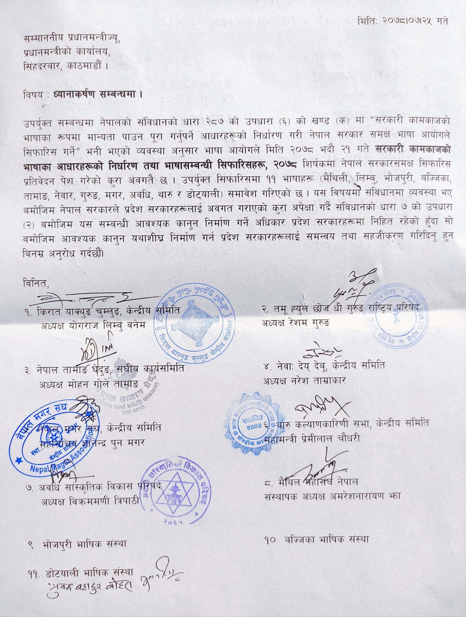 काठमाडौं । विभिन्न ११ भाषालाई प्रदेशको सरकारी कामकाजमा प्रयोग गराउन प्रधानमन्त्री शेरबहादुर देउवाको ध्यानाकर्षण गराइएको छ ।