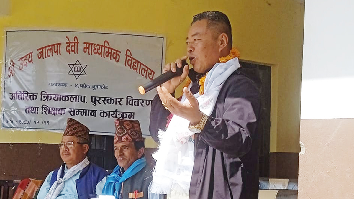 पञ्चकन्या ४ थप्रेकमा रहेको उदय जालपा माध्यमिक विद्यालयमा शुक्रबार आयोजित 'अतिरिक्त क्रियाकलाप पुरस्कार वितरण तथा शिक्षक सम्मान' कार्यक्रमलाई सम्बोधन गर्नुहुँदै माविहरुमा प्राय: प्राथमिक तहका शिक्षक प्रधानाध्यापक बनेकाले शैक्षिक गुणस्तर बढ्न नसकेको बताउनुभएको हो ।