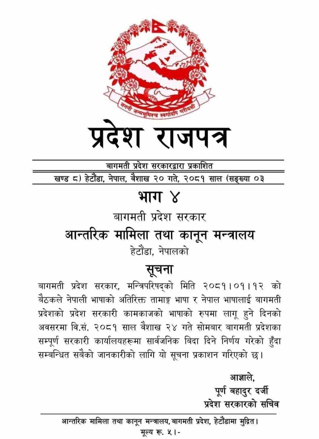 काठमाडौं । वाग्मती प्रदेश सरकारले बैशाख २४ गते (सोमबार) भोलि सार्वजनिक बिदा दिने निर्णय गरेको छ । वैशाख २४ गते तामाङ र नेपाल (नेवार) भाषालाई प्रदेशको सरकारी कामकाजको भाषाको रुपमा लागू हुने दिनको अवसरमा सोमबार वाग्मती प्रदेशका सम्पूर्ण सरकारी कार्यालयहरूमा सार्वजनिक बिदा दिने निर्णय गरिएको जनाएको छ ।