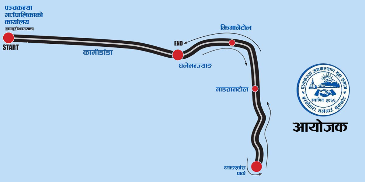 पञ्चकन्या गाउँपालिकाको कार्यालय लाकुरीभन्ज्याङबाट सुरू हुने दौड ‘घ्याङस्वाँरा सहिद स्मारक पर्यटकीय पार्क’ पुगी सोही रूट घलेभन्ज्याङ फिर्ता हुने जनाइएको छ । आयोजकका अनुसार खुला दौडतर्फ पुरुष र महिला दुवैका विजेता प्रथमले २२ हजार, दोस्रोले १६ हजार र तेस्रोले १० हजार पाउनेछन् ।