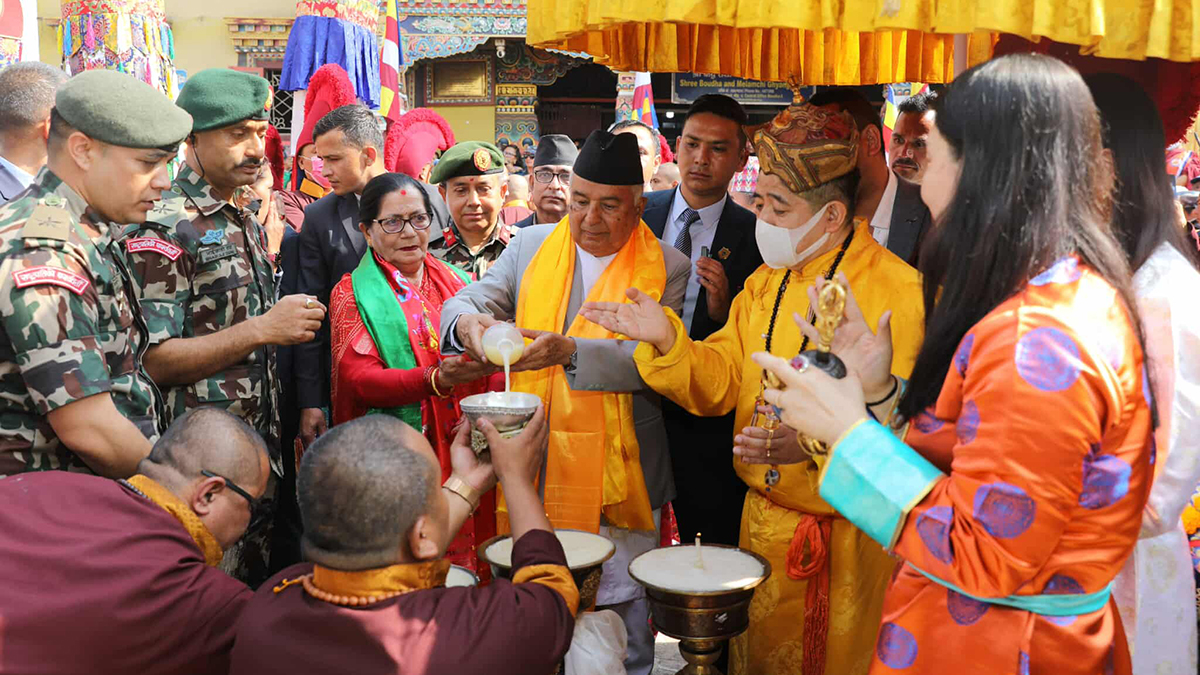 काठमाडौँ । राष्ट्रपति रामचन्द्र पौडेल प्रथम महिला सबिता पौडेलले पच्चीस सय ६९ औँ बुद्धजयन्तीका अवसरमा बौद्धनाथस्थित गुरु ल्हाखाङ गुम्बामा भगवान् गौतमबुद्धको पूजा, आराधना गर्नुभएको छ । सो अवसरमा राष्ट्रपति पौडेलले बौद्ध महाचैत्यको परिक्रमा गर्नुका साथै अमूल्य अस्तुधातु दर्शन गर्नुभएको थियो । बुद्धजयन्तीका अवसरमा पूजा आराधनासहित अस्तुधातु दर्शनका लागि राष्ट्रपति पौडेल प्रथम महिला सविता पौडेलसहित बौद्ध पुग्नुभएको थियो ।