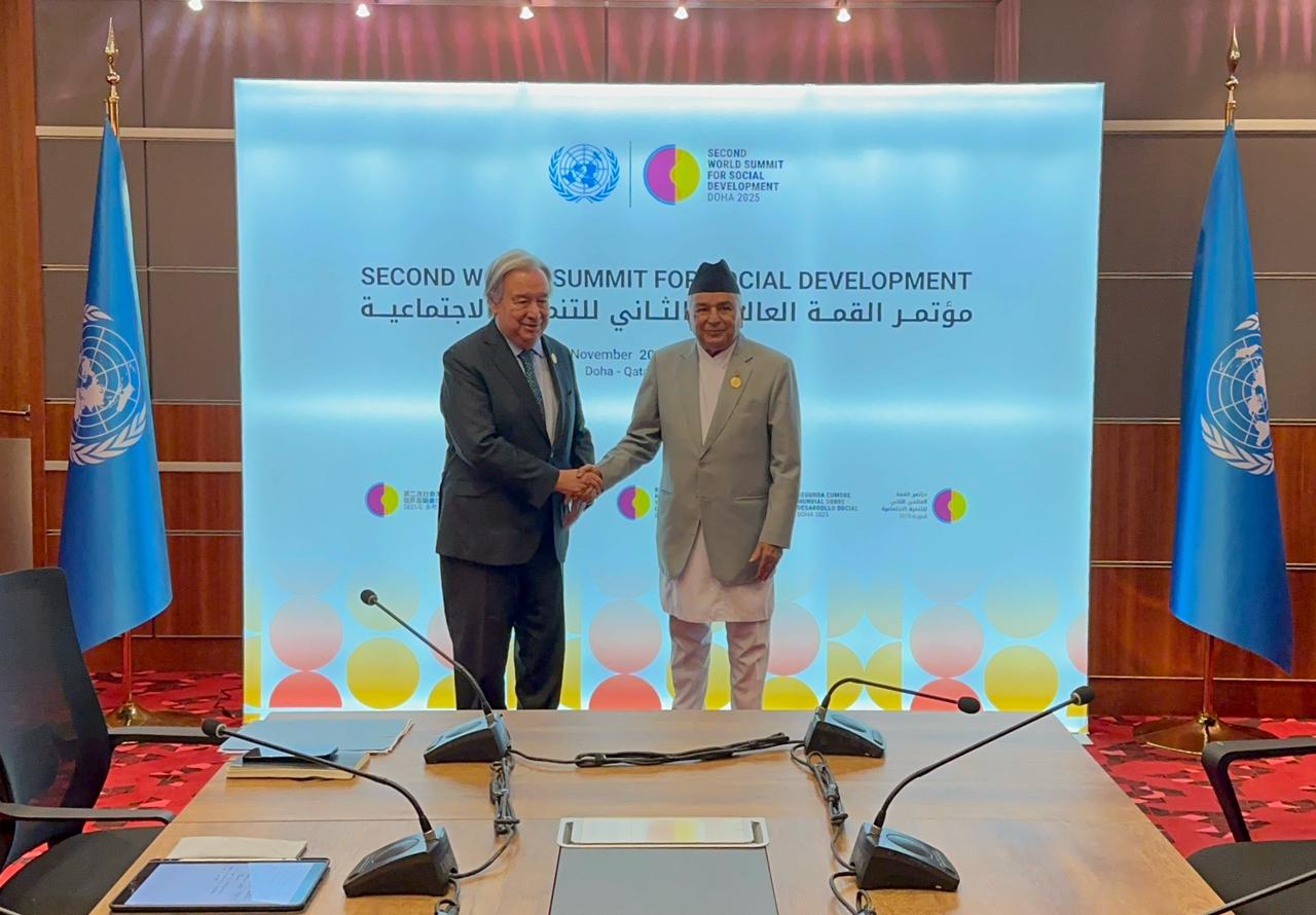 काठमाडौं । ‘सामाजिक विकासका लागि दोस्रो विश्व शिखर सम्मेलन’मा सहभागी हुने सिलसिलामा कतारको राजधानी दोहामा रहनुभएका राष्ट्रपति रामचन्द्र पौडेलसँग संयुक्त राष्ट्रसङ्घका महासचिव एन्टोनियो गुटेरेसले आज शिष्टाचार भेट गर्नुभएको छ ।