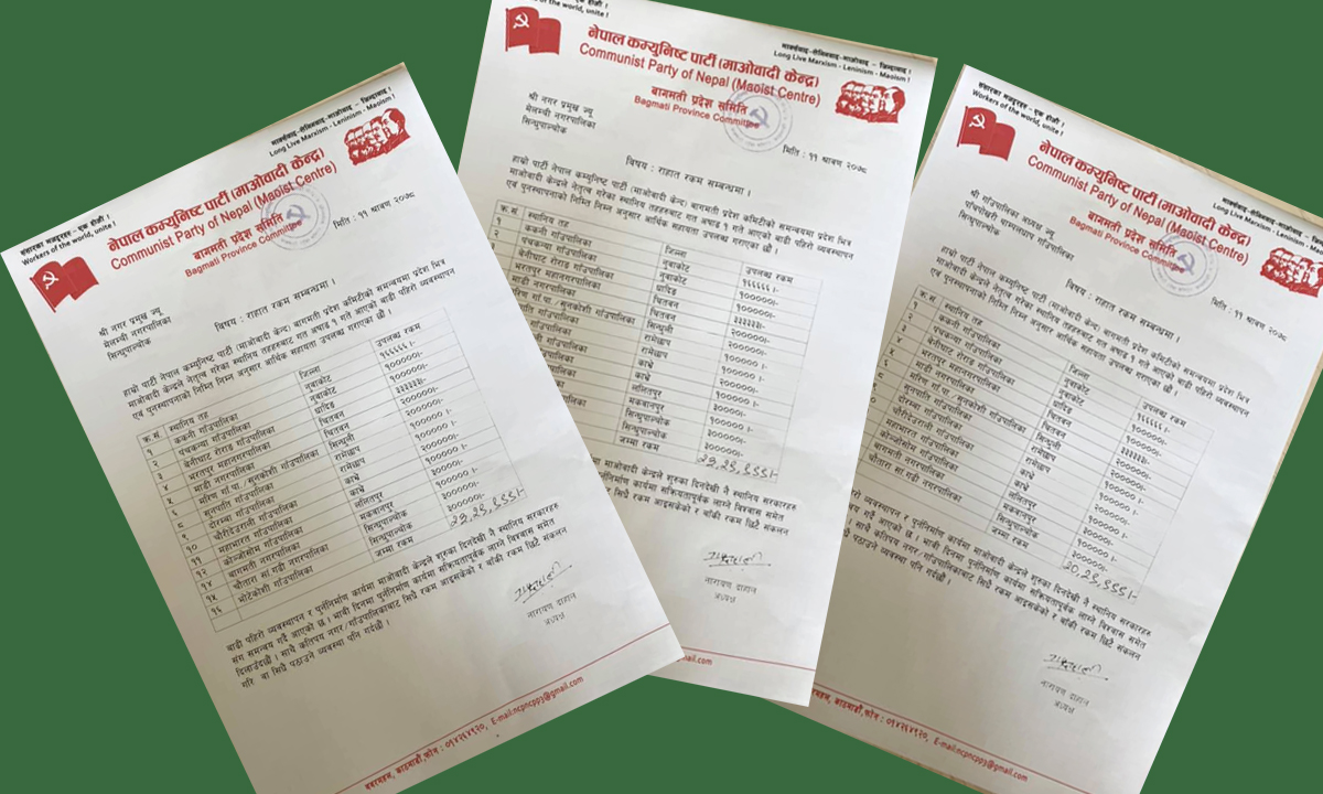 सोमबार मेलाम्चीमा एक कार्यक्रमका बीच माओवादी केन्द्र वागमती प्रदेशका अध्यक्ष नारायण दाहाल, सहइन्चार्जद्वय हितबहादुर तामाङ र हितमान शाक्य, केन्द्रीय सदस्य तथा बागमती प्रदेशसभा सदस्य युवराज दुलाल, माधव सापकोटा लगायतको उपस्थितिमा उक्त रकम हस्तान्तरण गरिएको हो ।