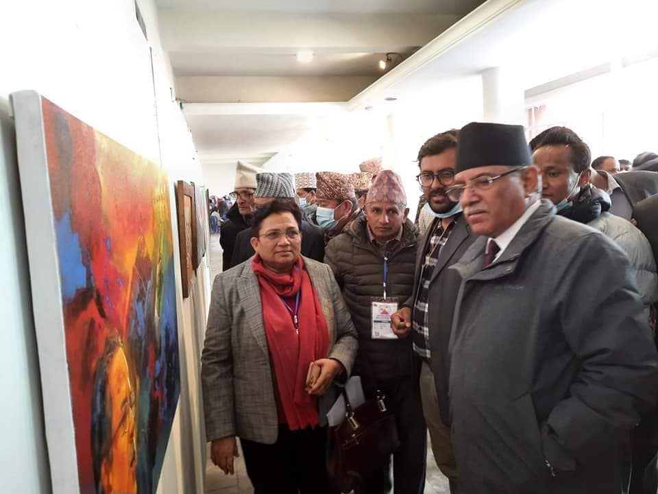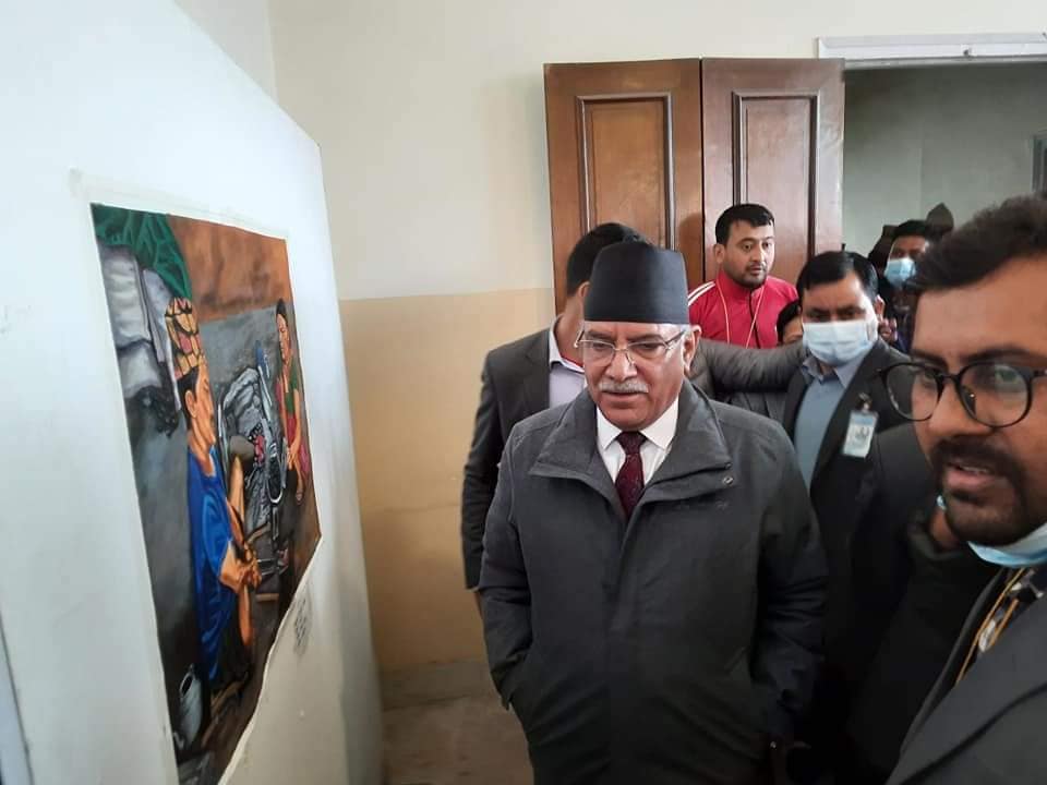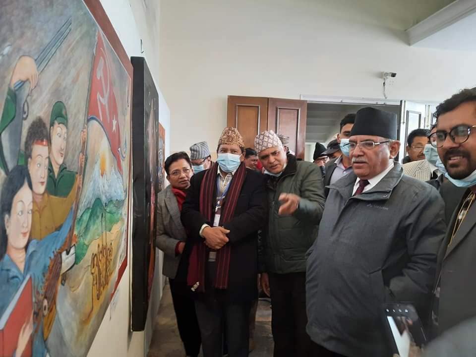 उहाँले श्रमसँग जोड्ने कुरा राम्रो विषय उठान भएको प्रतिक्रिया दिनुभयो । “एक्सन कमरेड अध्यक्षबाटै हुनुपर्छ”, चित्र अवलोकनका क्रममा खनालले राखेको भनाइमा अध्यक्ष दाहालले भन्नुभयो, “अँ एकदम ।” अर्का ८० वर्षीय अग्रज कलाकार जुलुमलाल चित्रकारले मुलुकको गरिबीको गम्भीर समस्या रङको माध्यमबाट देखाउनुभएको छ । सुत्केरी उतार्न समस्या छ, धान राख्ने घ्याम्पो खाली छ, बच्चाहरु भोकै छन्, मानिस मागेर गुजारा चलाउन विवस छन् ।