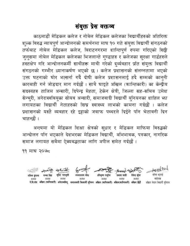 संयुक्त विद्यार्थी संगठनले मंगलबार जारी विज्ञप्तिमा देशभरका मेडिकल विद्यार्थी, अभिभावक, पत्रकार नागरिक समाजलगायतलाई जारी आन्दोलनमा सहभागिता र ऐक्यबद्धताको लागि अपिल गरेको हो । नेविसंघ अध्यक्ष राजीव ढुंगाना, अखिल(क्रान्तिकारी) अध्यक्ष पञ्चा सिंह, अनेरास्ववियु अध्यक्ष सुदेश पराजुली, समाजवादी विद्यार्थी युनियनका अध्यक्ष रुपनारायण श्रेष्ठ, मोहन वैद्य निकट अखिल (क्रान्तिकारी)का हरिकृष्ण गजुरेल, विप्लवनिकट विद्यार्थी संगठनका अध्यक्ष प्रकाश शाही, अखिल छैठौंका देवेन्द्र कुँवर र अखिल नेपाल विद्यार्थी युनियनका अध्यक्ष मनिष भट्टराईद्वारा हस्ताक्षरित विज्ञप्तिमा कलेज प्रशासनको दुर्ववहार र दमनको निन्दा गर्दै घाइते विद्यार्थीहरुको स्वास्थ्यलाभको कामना गरिएको छ । काठमाडौं मेडिकल कलेज र नोबेल मेडिकल कलेजमा अतिरिक्त शुल्कविरुद्ध चलेको आन्दोलनमा विद्यार्थी र कलेज प्रशासनबीच समझदारी कायम हुन नसक्दा आन्दोलन थप मुठभेडतर्फ अघि बढेको थियो ।