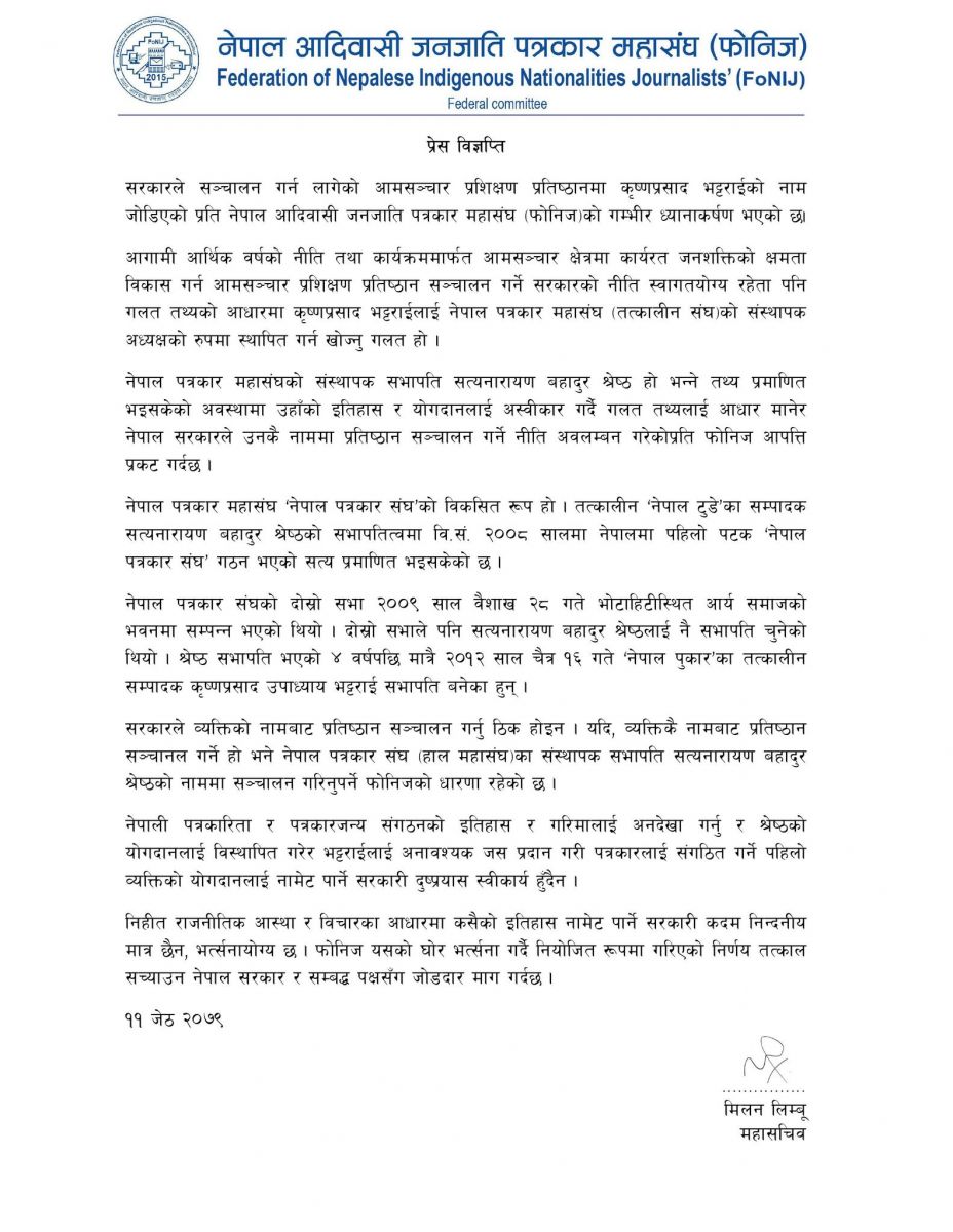 नेपाल पत्रकार महासंघको संस्थापक सभापति सत्यनारायणबहादुर श्रेष्ठ हो भन्ने तथ्य प्रमाणित भइसकेको दाबी गर्दै फोनिजले गलत तथ्यको आधारमा सरकारले कृष्णप्रसाद भट्टराईलाई नै पत्रकार महासंघको संस्थापक अध्यक्षको रुपमा प्रस्तुत गर्न खोज्नु गलत रहेको विज्ञप्तिमा उल्लेख छ ।