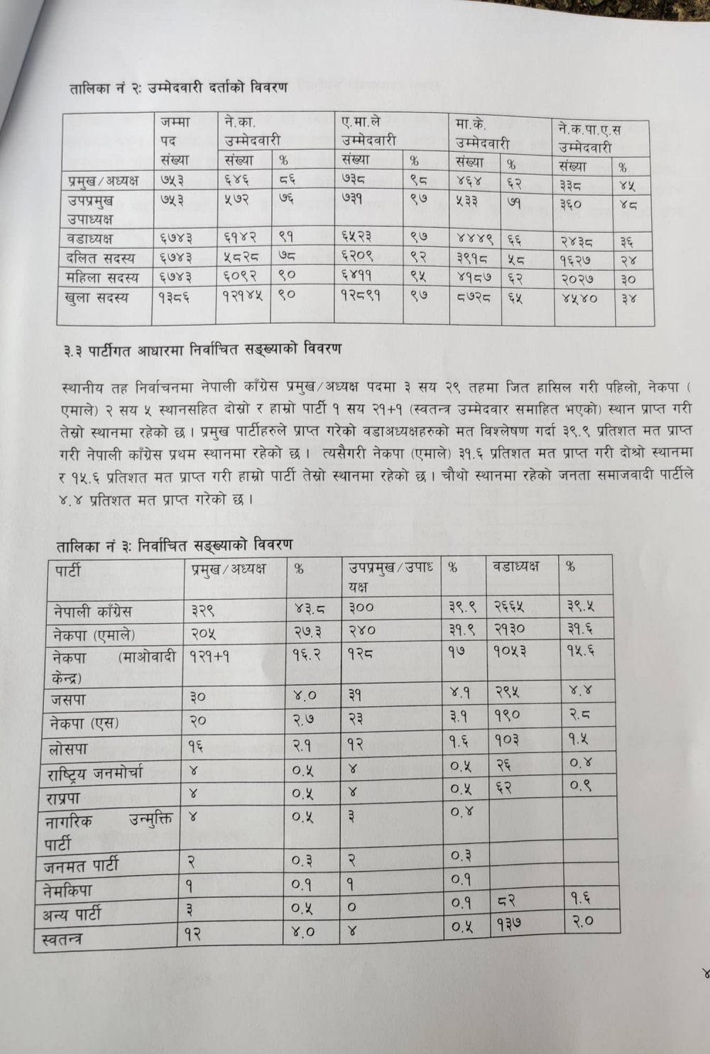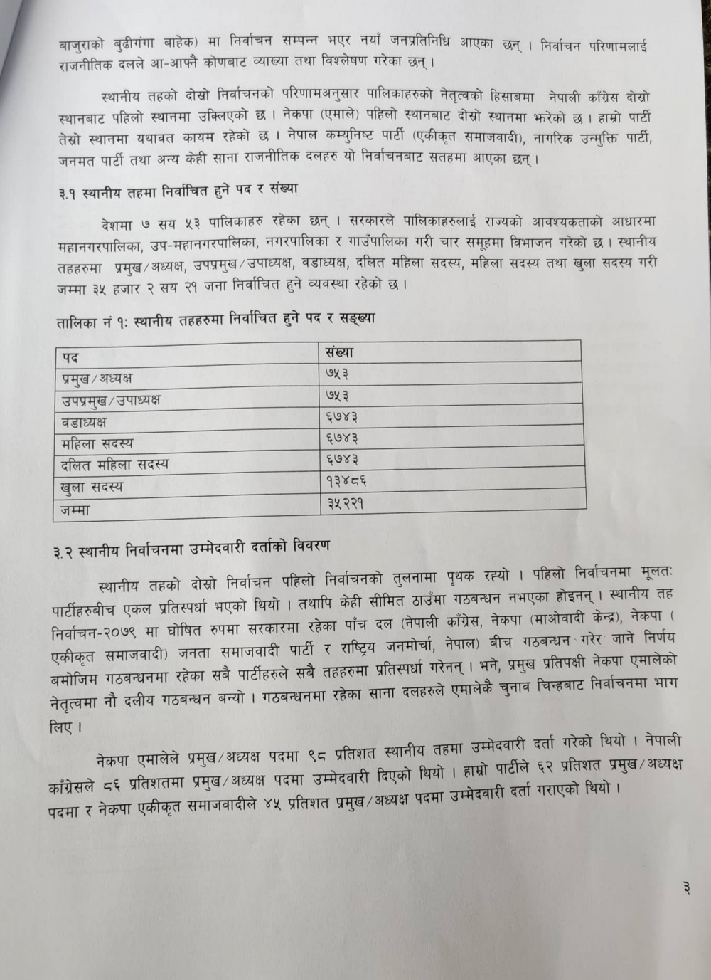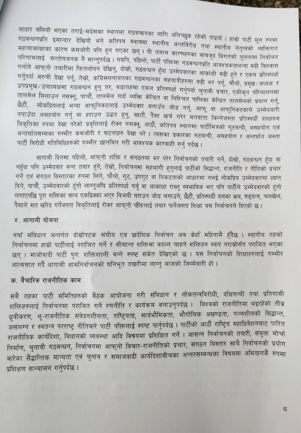 “नयाँ संविधानअन्तर्गत दोस्रो पटक सङ्घीय एवम् प्रादेशिक निर्वाचन केही महिनामा हुँदैछ । स्थानीय तहको निर्वाचनमा हाम्रो पार्टीलाई पराजित गर्ने र सीमान्त शक्तिमा बदल्न चाहने शक्तिहरू स्वयम् नराम्ररी पराजित भएका छन् । माओवादी पार्टी पुनः शक्तिशाली बन्ने स्पष्ट संकेत देखिएको छ । यस निर्वाचनको शिक्षालाई गम्भीर रुपमा आत्मसात् गर्दै आगामी आम निर्वाचनको घनिभूत तयारीमा लाग्नु आजको प्रमुख जिम्मेवारी हो”, अध्यक्ष दाहालको प्रतिवेदनमा भनिएको छ ।