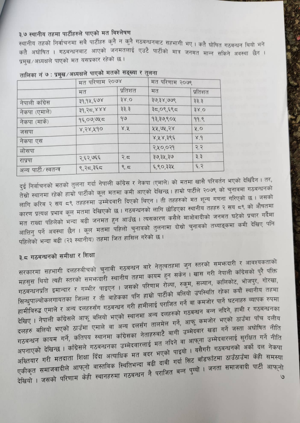 “एउटा वडा जित्दासमेत खुशी हुनुपर्ने अवस्था आयो । एक्लाएक्लै लडेको भए पनि हाल प्राप्त भएको भन्दा धेरै स्थानमा जीत निकाल्न सकिने रहेछ । हामी गठबन्धनमा इमान्दार भए पनि काँग्रेसले इमान्दारिता देखाएन”, उहाँले भन्नुभयो, “राजधानी र मधेश प्रदेशमा हाम्रो उपस्थिती प्रभावकारी बन्न सकेन । यसमा निर्मम समीक्षा गरौं ।”
