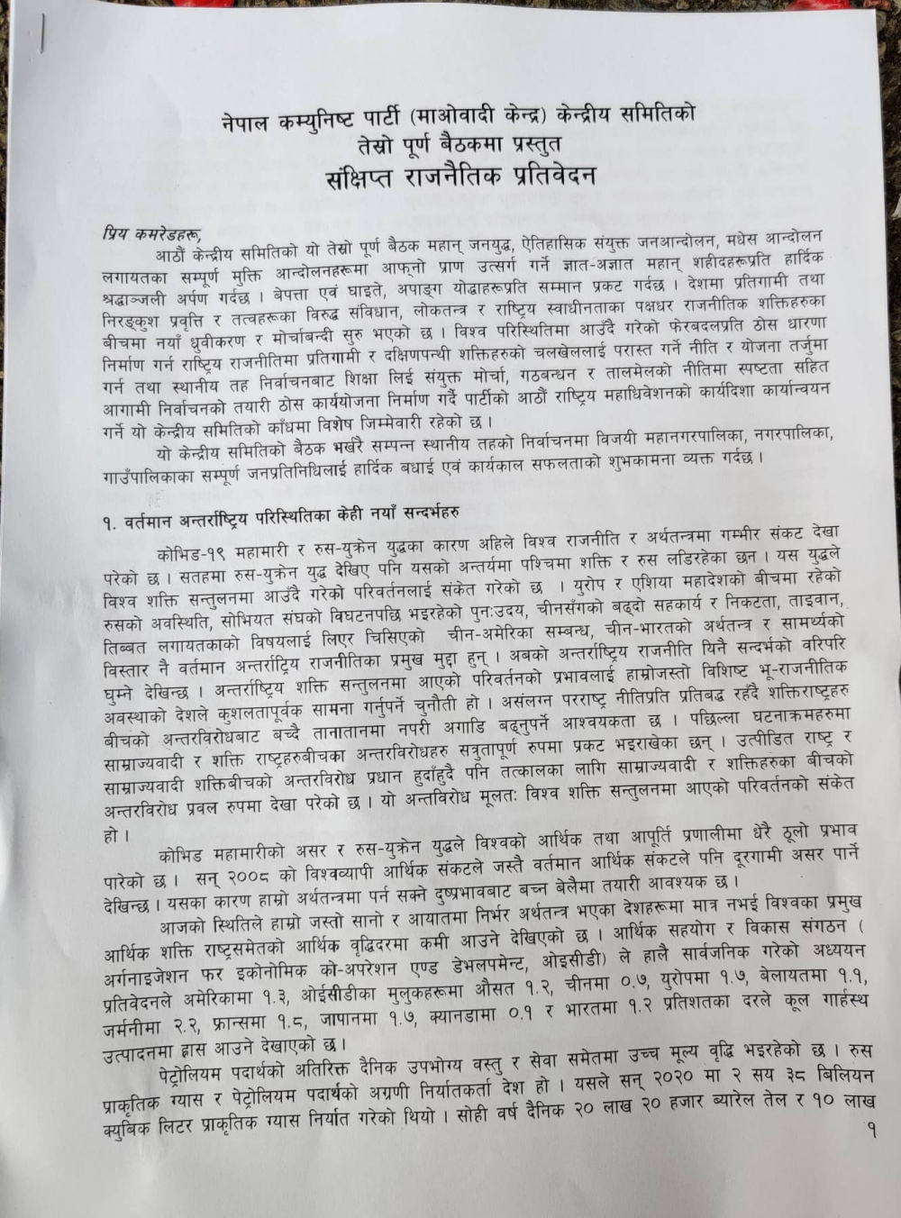 अघिल्ला बैठकमा अध्यक्षकातर्फबाट राजनीतिक प्रतिवेदन पेश गर्ने गरिएको भए पनि यस पटक संक्षिप्त टिपोट प्रस्तुत गरेर त्यसमा छलफल गराउन लागिएको छ । अध्यक्ष प्रचण्डले १० पेज लामो संक्षिप्त राजनीतिक प्रतिवेदन पेश गर्नुभएको छ । त्यसमा पार्टीले आगामी दिनमा अबलम्बन गर्नुपर्ने नीति, योजना र कार्यक्रमका बारेमा उल्लेख गरिएको छ ।