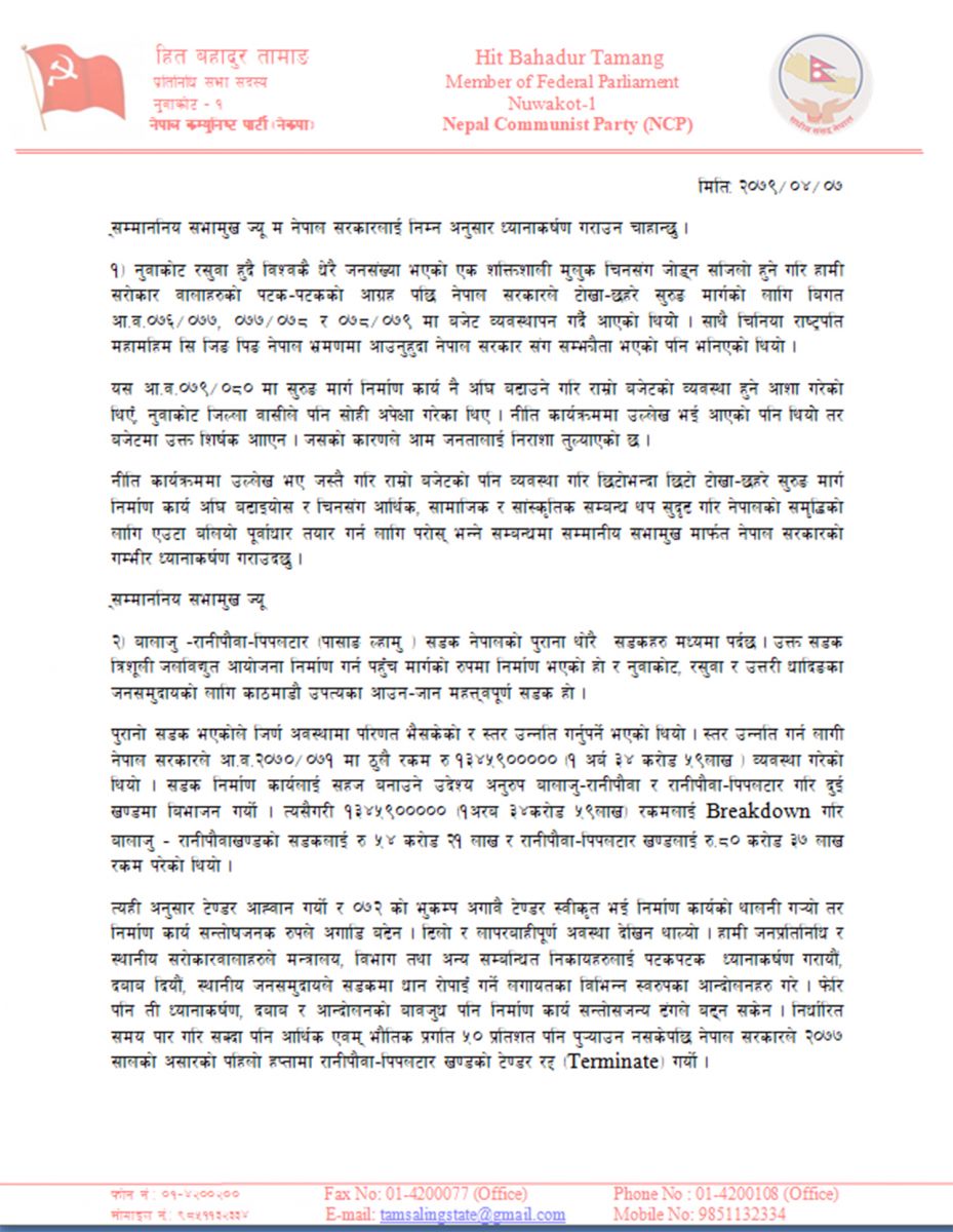 नुवाकोट, रसुवा हुँदै विश्वकै धेरै जनसंख्या भएको शक्तिशाली मुलुक चीनसँग जोड्न सजिलो हुने गरि आफूहरु सरोकारवालाहरुको पटक–पटकको आग्रहपछि नेपाल सरकारले टोखा–छहरे सुरुङमार्गको लागि विगत आ.व.०७६/७७, ०७७/७८ र ०७८/७९ मा बजेट व्यवस्थापन गर्दै आए पनि वर्तमान सरकारले बजेट नछुट्याएकोमा उहाँको आपत्ति थियो ।