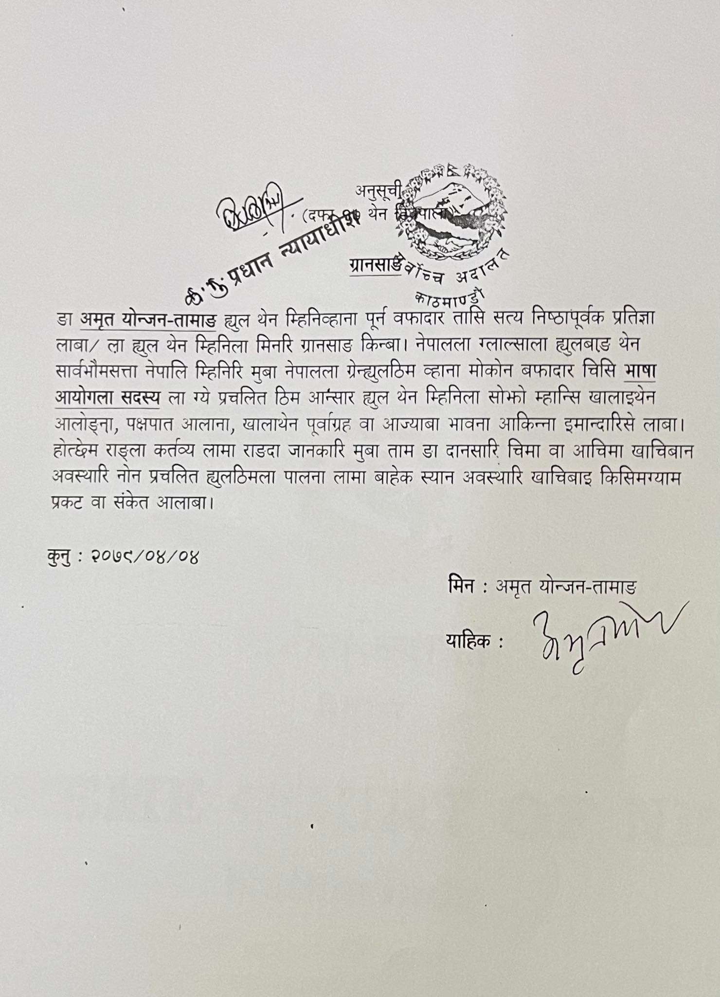 यसै क्रममा नाम र पदसहित नेपालीमा छापिएको शपथपत्रको प्रति हाम्रो हात हातमा पर्यो । फाइल आकर्षक थियो । केहीबेरमा प्रधानन्यायाधीशले हामीलाई शपथ ग्रहण गराउनुभयो । शपथ ग्रहण सकिएलगत्तै वहाँले मतिर हेर्दै भन्नु भयो- ‘तपाईं तामाङ भाषामा शपथ ग्रहण गर्नु होस्।’ म आश्चर्यचकित भएँ । यो अनपेक्षित थियो । कोटको खल्तीबाट शपथ पत्र निकालेर मैले तामाङ भाषामा शपथ लिएँ ।