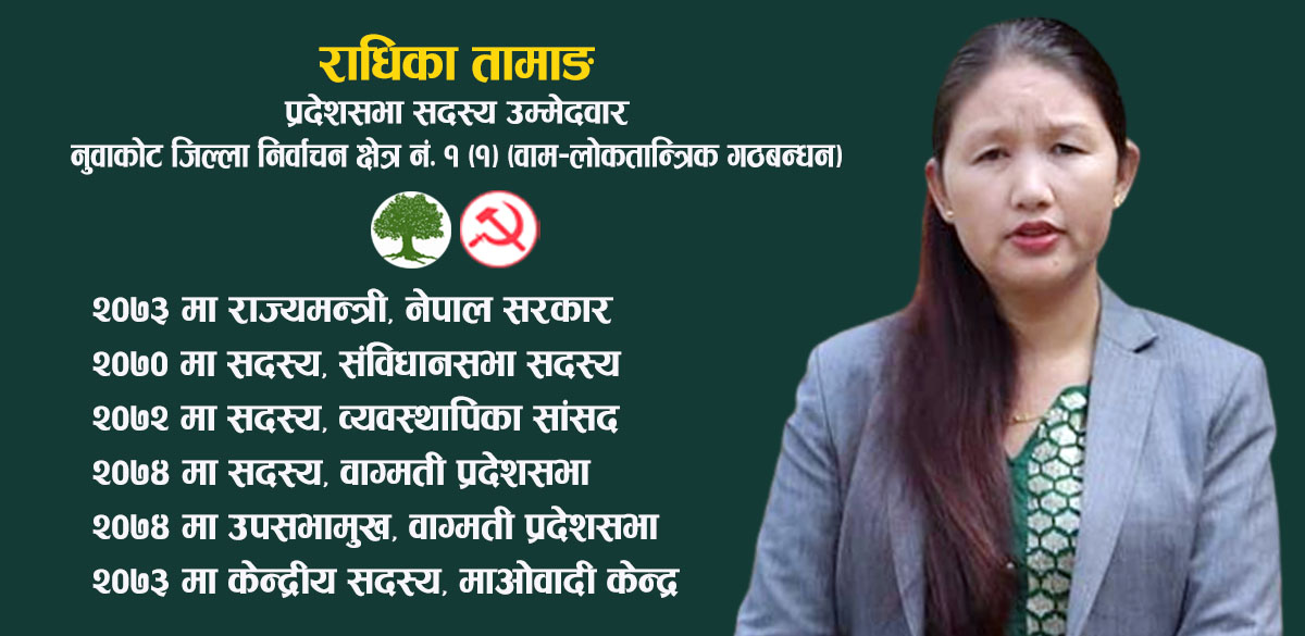 नुवाकोट निर्वाचन क्षेत्र नम्बर १ (१) मा प्रत्यक्षतर्फ चुनावी मैदानमा हुनुहुन्छ राधिका तामाङ । अघिल्लो निर्वाचनमा वाम गठबन्धन अर्थात् नेकपा माओवादी केन्द्र र नेकपा एमालेको साझा उम्मेदवार बन्नुभएका तामाङ यसपटक हिजोका प्रतिस्पर्धी दल नेपाली कांग्रेसको समर्थनमा चुनाव लड्दै हुनुहुन्छ ।