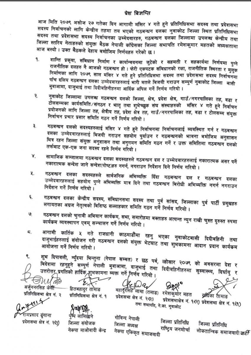 पत्रकारहरुले पनि गठबन्धनको महत्व र औचित्यतालाई ख्यालमा राखेर समाचार सम्प्रेषण गर्नेमा उहाँले विश्वास व्यक्त गर्नुभयो । 'प्रतिगमनको खतरा अहिले पनि छ । प्रतिगमनलाई परास्त गर्ने उद्देश्यले र संविधान, लोकतन्त्र रक्षा र सुदृढीकरण गर्ने । शान्ति र स्थितरता कायम गराउँदै दीगो विकास र समृद्धि हासिल गर्ने उद्देश्य अनुसार हामी अगाडि बढिरहेका छौं,' उहाँले भन्नुभयो, 'यसलाई सम्पन्न गर्नका निम्ति भयरहित तरिकाले निर्वाचनमा सबै मतदाताहरुलाई सहभागी गराउन हाम्रा पार्टीका सबै नेता, कार्यकर्ता लाग्नुपर्दछ । म यही आह्वान गर्छु ।' प्रतिनिधिसभा क्षेत्र नम्बर २ का उम्मेदवार एवं नेपाली कांग्रेसका केन्द्रीय सदस्य अर्जुननरसिंह केसीले पनि संविधान, लोकतन्त्रको रक्षाको निम्ति गठबन्धन बनेको उल्लेख गर्नुहुँदै नुवाकोटको सम्मान, इज्जत र प्रतिष्ठालाई जोगाउन र जिल्लाका विकास निर्माणका गतिविधिहरु सामूहिकरुपमा अघि बढ्ने प्रतिबद्धता जनाउनुभयो ।