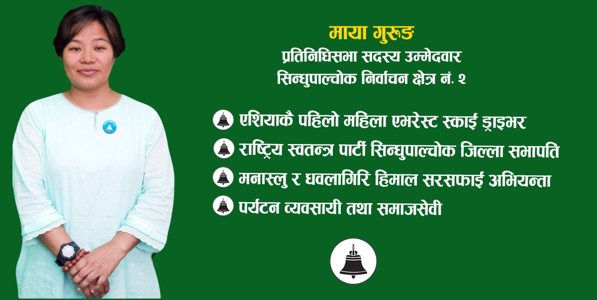 सिन्धुपाल्चोक पाँचपोखरी थाङ्पालधाप गाउँपालिका-७ भोटेनाम्लाङ निवासी ४३ वार्षीय माया गुरुङ राष्ट्रिय स्वतन्त्र पार्टी (रास्वपा) का जिल्ला सभापति, सामाजिक अभियान्ता, पर्यटन व्यवसायी, समाजसेवी र एक निडर, साहसिक पर्वतारोही महिला हुनुहुन्छ । नेता गुरुङ मंसिर ४ गते हुने संघ र प्रदेशको आसन्न निर्वाचनमा राष्ट्रिय स्वतन्त्र पार्टीबाट सिन्धुपाल्चोक क्षेत्र नं २ को प्रतिनिधिसभा सदस्यको उम्मेदवार पनि हुनुहुन्छ।