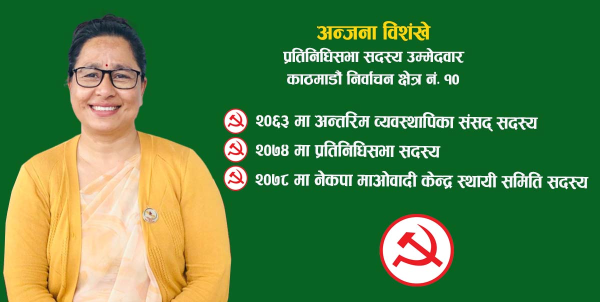 नेकपा माओवादी केन्द्रले काठमाडौं निर्वाचन क्षेत्र नम्बर १० बाट प्रतिनिधिसभाका लागि संघर्षशील नेता अन्जना विशंखेलाई मैदानमा उतारेको छ । काठमाडौंमै जन्मी हुर्की मुलुक परिवर्तनको आन्दोलनमा होमिएका विशंखे एक परिचित नाम हो ।
